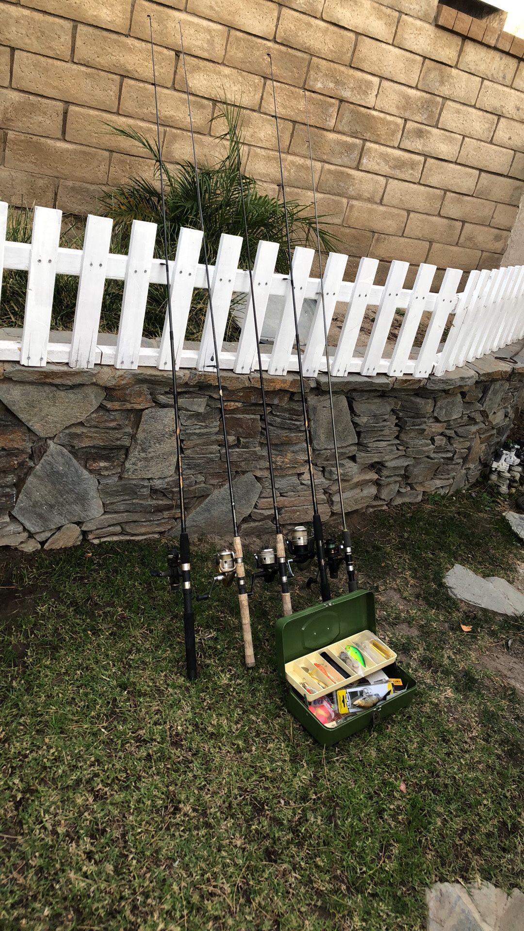 FIVE (5) Shimano Fishing Rods with Shimano Reels plus a Tackle Box Full of Lures,Hooks and more.All are in Good working order but two of the rods are shorter than they should be.All the fishing stuff in pictures for $100.00.Santa Clarita for pick up near Plum and Bouquet Canyon Road