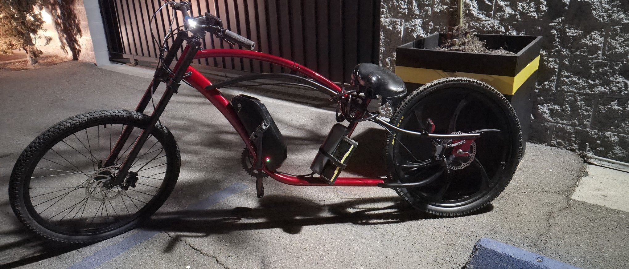 It's 48, V with the 750 W rear end cat, 26 and the 27 and a 1/2 in the front mag. Wheels, it's a schwin, customized frame. All electric custom https://offerup.com/redirect/?o=YnJha2VzLkl0's got a good battery on it to fi48 volt 15 a.H like I said, you gotta see it to believe it.But it's really cool π custom tangerine Paint