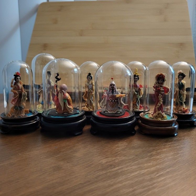 Mid 20th Century 7 Geisha plus 2 male figurines Sealed under glass on wooden stands 3.5" H Handcrafted and painted Made of clay Finely detailed Sold all together
