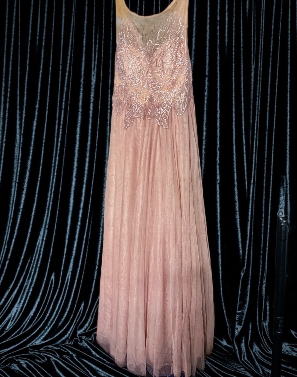 Color: A shade of pink or blush. Bodice: Features intricate floral embroidery and a sheer overlay. Skirt: A long, flowing A-line or ballgown style made of layered mesh or tulle fabric. Style: An elegant and glamorous look suitable for a prom or special occasion.