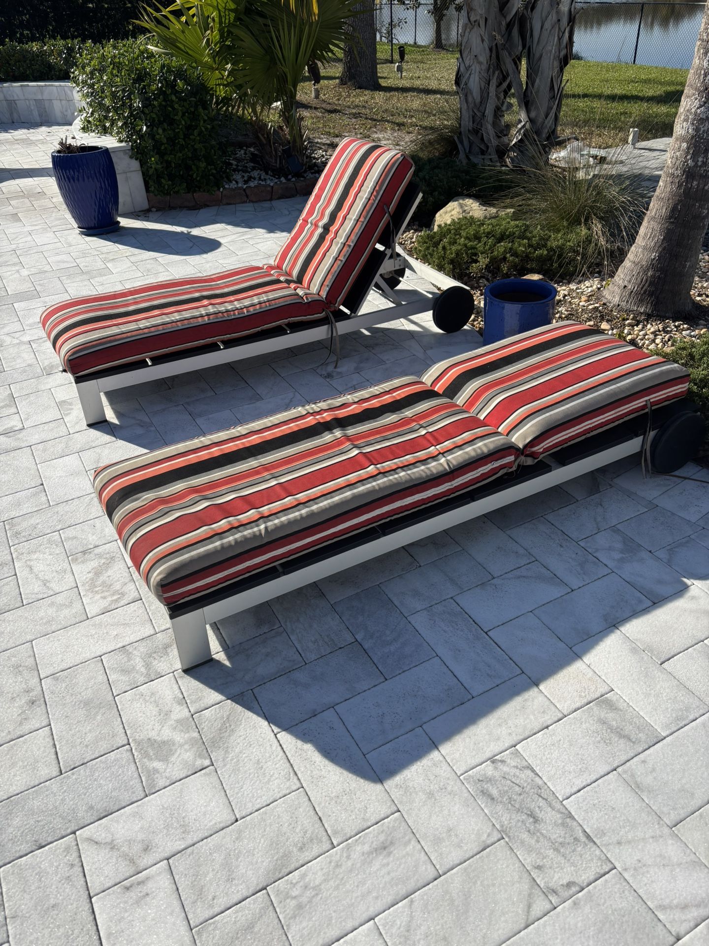 All aluminum will never rust outside/pool lounge. Comes with Sunbrella cushions.