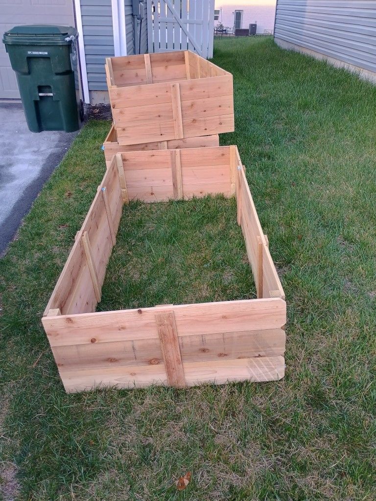 Cedar Raised Garden Beds for Raised Gardening Handmade without the use of chemicals or pressure treated wood We use cedar wood which is naturally resistant to rot and insects We build them here in your local region and deliver all over the area for a reasonable delivery fee typically around 45 bucks just send your zip for a quote on that or pickup nearby your area We have several sizes 8x4 (or 8x3) for 165 6x3 for 145 They are 16 inches high We do 11 inch high for 20 bucks less and 22 inch for 30 bucks more Gardening is good for your wallet Good for your health Good for the planet And good for your friends who are lucky enough to share in your fresh veggies And you don't need to buy our garden beds you can start gardening for free Raised bed gardening is easier to start and easier to maintain Our garden beds are light to move before you ad soil And come with a fresh red cedar look that turns to a neutral gray over time. They show beautiful wood grain. And are made with 1 bys reinforced with braces pieces and 2 by redwood corners. We use exterior decking screws and large lag-like framing screws for reinforcement. They look really good and will last for years (goal is 10 plus or minus). Similar beds with less craftsmanship and little to no screws, which is the strongest fastening system, are available from big box stores for up to $100 more than our price and some may require assembly. If you want to pickup flat we can meet you off of our delivery route and load for you and give you just a few screws to put into each corner with a drill or delivery is often as low as $45 for as many beds as you order. For further questions don't hesitate to ask. We are available here or by phone. Thanks for coming to Facebook for simplicity for you and supporting local for people like us and the planet. We have reviews on Google and references available As well as more picture just ask This is our 4th year making these and have met many wonderful people and learned a lot. The man who designed them is our mentor and was a custom home builder for years so is extremely intelligent in construction. If you would like us to drop off in your driveway we can drop off to you wether you are home or not. They are light to move and we can accept payment when you see them.