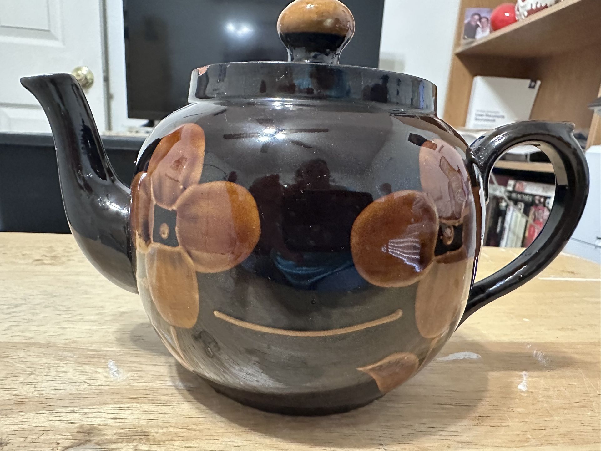 Lang Pottery ceramic tea pot. Measures 4 inches tall. There’s a small chip in the rim but other than that it’s in good shape.