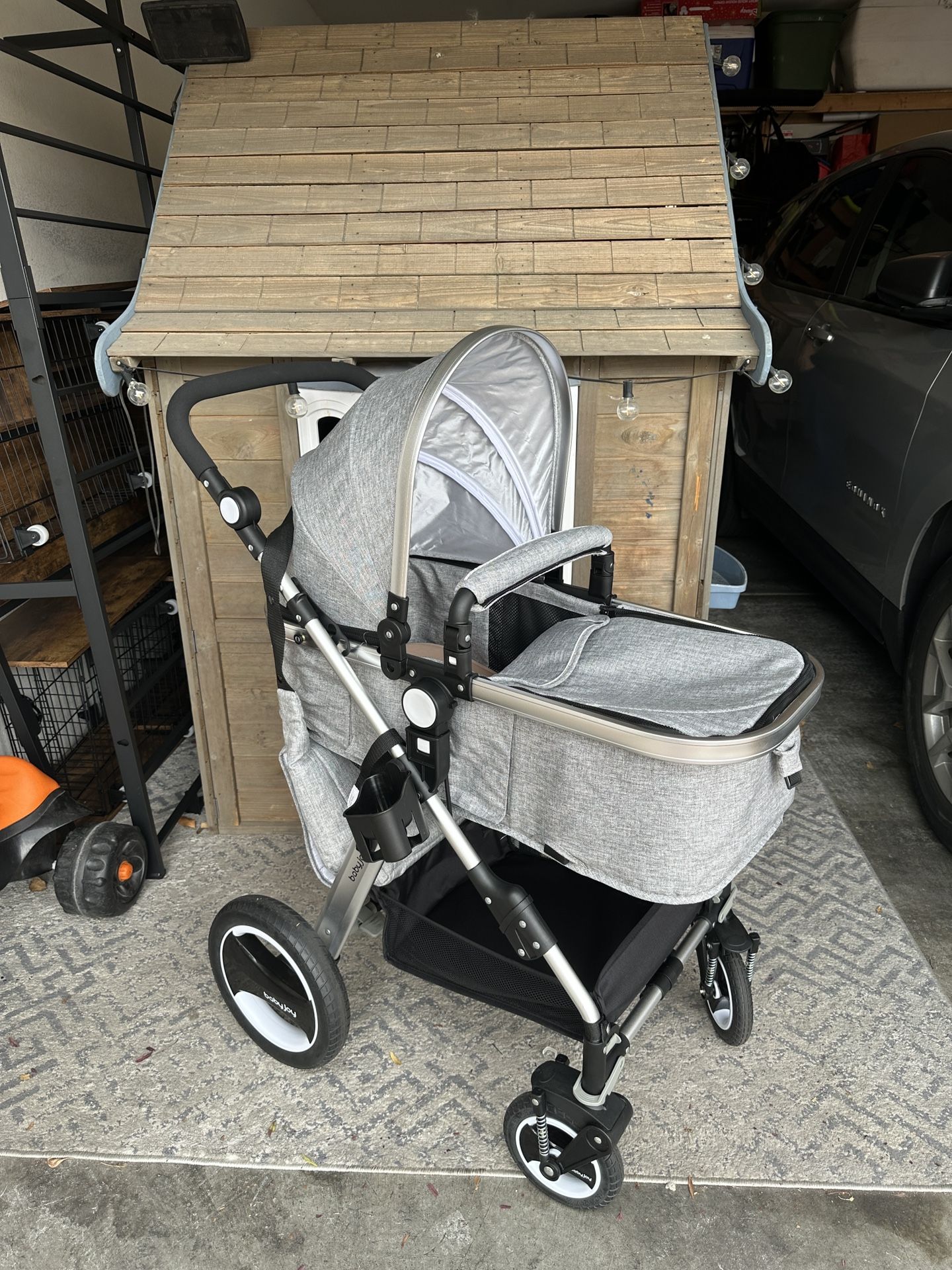 BABY JOY Baby Stroller, 2-in-1 Convertible Bassinet Reclining Stroller, Foldable Pram Carriage with 5-Point Harness, Including Cup Holder, Foot Cover, Diaper Bag, Aluminum Structure. Used twice and still in brand new condition. Firm on price. Pick up only. Silverado ranch area. Maryland & Cactus. No pet or smoking household.