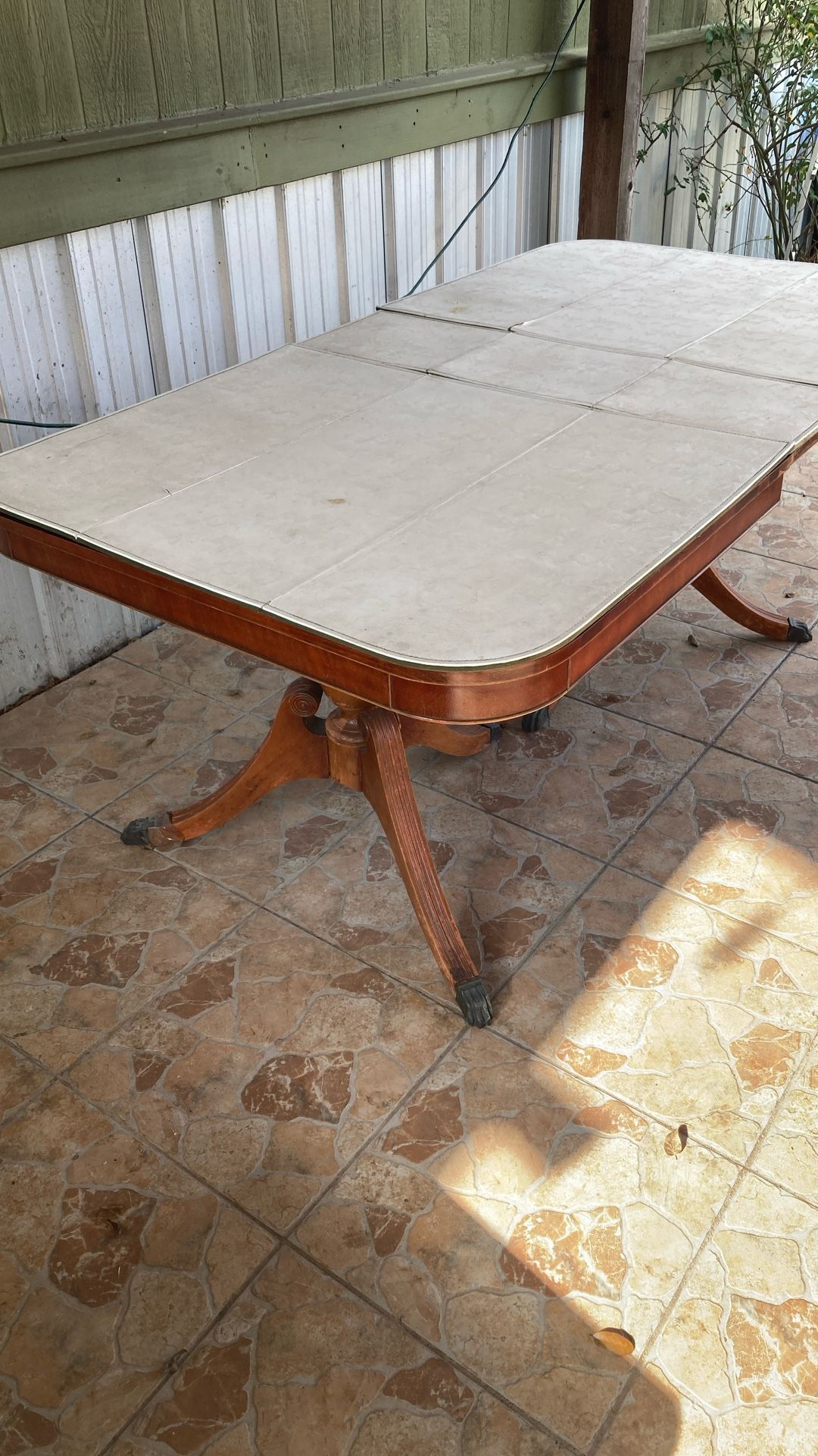 Solid wood. Tabletop has some water damage. Claw foot table, only. Table comes with protection cover and a leaf insert. The table is on our back porch. It is a big, covered porch, but it has received some water damage over the past year.