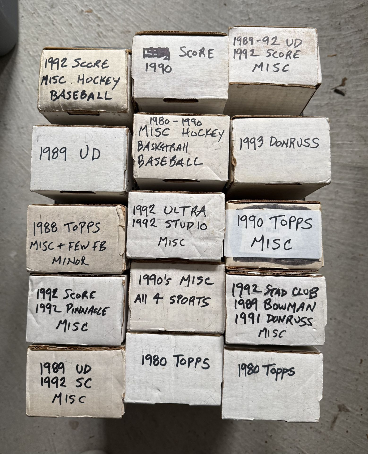 This is a Milkcrate of 800 card boxes of sports cards. There are 15 boxes. Most of them are full. I would estimate over 10,000 cards. These are mostly commons however there are some semi stars and a few Hall of Famer‘s sprinkled in the majority is baseball however there are a handful of hockey basketball and football and maybe a random non-sport card to mixed then not sure anyway this is price accordingly and it’s sold as is and there’s no shipping no holds first come first serve thanks for looking