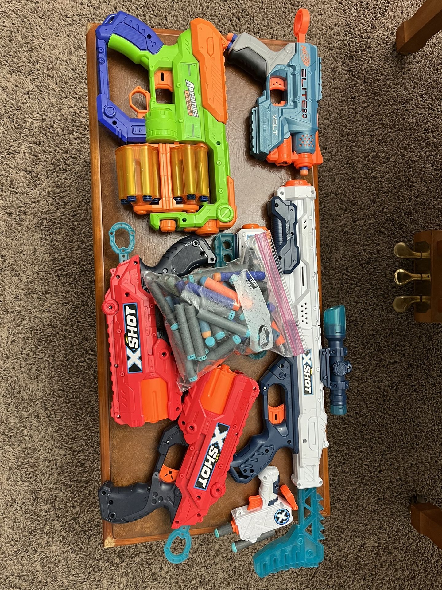 7 X-shot nerf guns and 70+ darts Used but in really good condition
