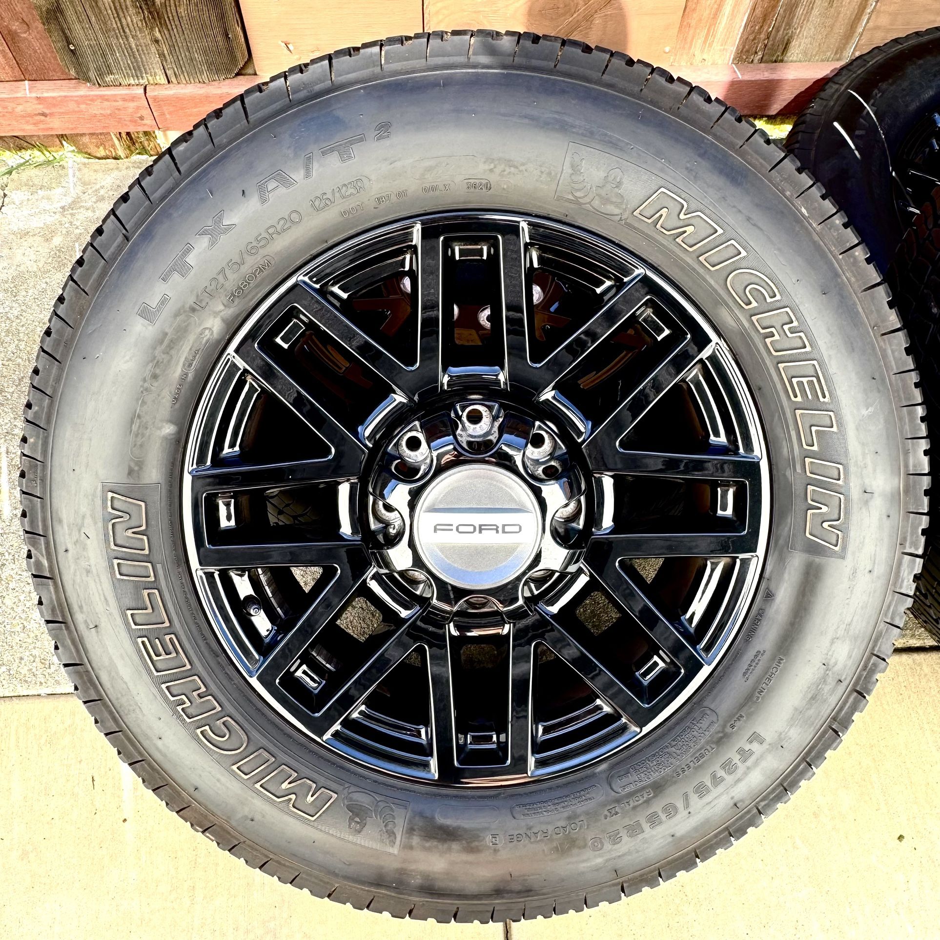 Set of Factory 20” Ford F250 Lariat Gloss Black OEM Powerstroke Wheels off a 21’ w/ sensors and factory lug nuts and 275/65r20 Michelin LTX AT2 65% tread Wheels are 20” with the 8x170 1999 and newer F250 and F350 lug pattern Ready to mount with no cracks, bends or gouges and were removed and stored to run 22s w/ some scratches/ knicks Located in Lodi The the F250 Gloss Black Lariat rims alone are selling for $2,400 and the 275/65r20 Michelin LTXs are a $1,700 set of tires; $4,100 setup $1,400 obo