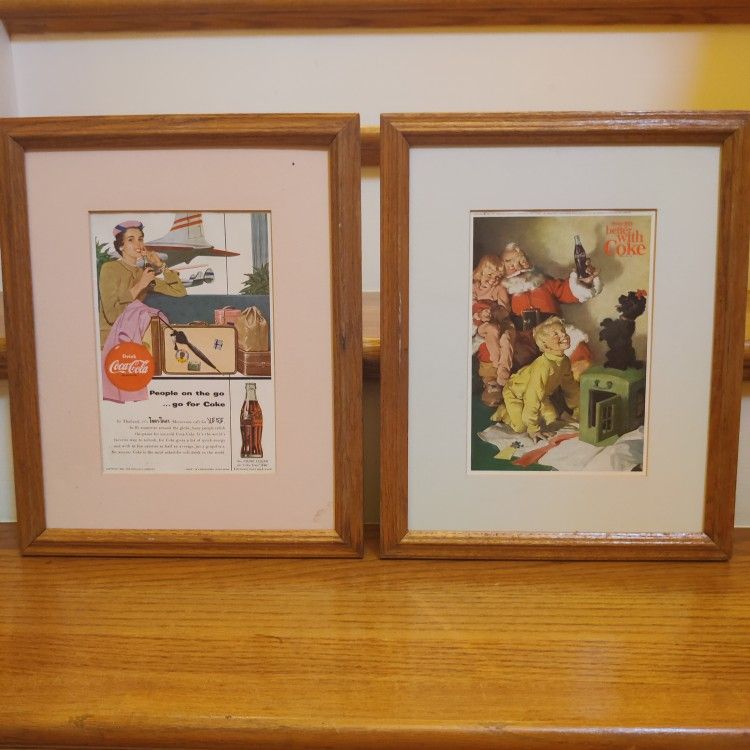 One is a 1964 Coca-Cola Santa Claus Advertisement, RARE, "Things Go Better With A Coke" Framed and matted (no Glass). [$35]. The other is a 1954 Coca Cola "People on the go...go for Coke" Ad -Coke /vintage ad / "The pause that refreshes" / Travel coke ad. Here's a great Coca-Cola ad: "People on the go ... go for Coke." This is a vintage magazine advertisement. The ad, which is 6 7/8 by 10 inches comes from a 1954 National Geographic. [$30]. It is matted but not framed. Both are in good vintage condition as in photos. Colors still good . Perfect for Coca-Cola collectors or those who like vintage advertising. Porch pickup from smoke-free home. (COKE12).