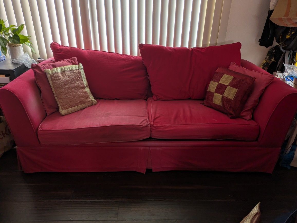 20 year old lived-in red couch & matching throw pillows (not all throw pillows in picture). 85" x 38" Not gonna lie, it is starting to show it's age! You will probably need to get a small flat piece of wood for the left side because the springs have started to go. Great opportunity for a DIY-er who loves to bring new life to old pieces. You will need to navigate an outdoor staicase (one story).