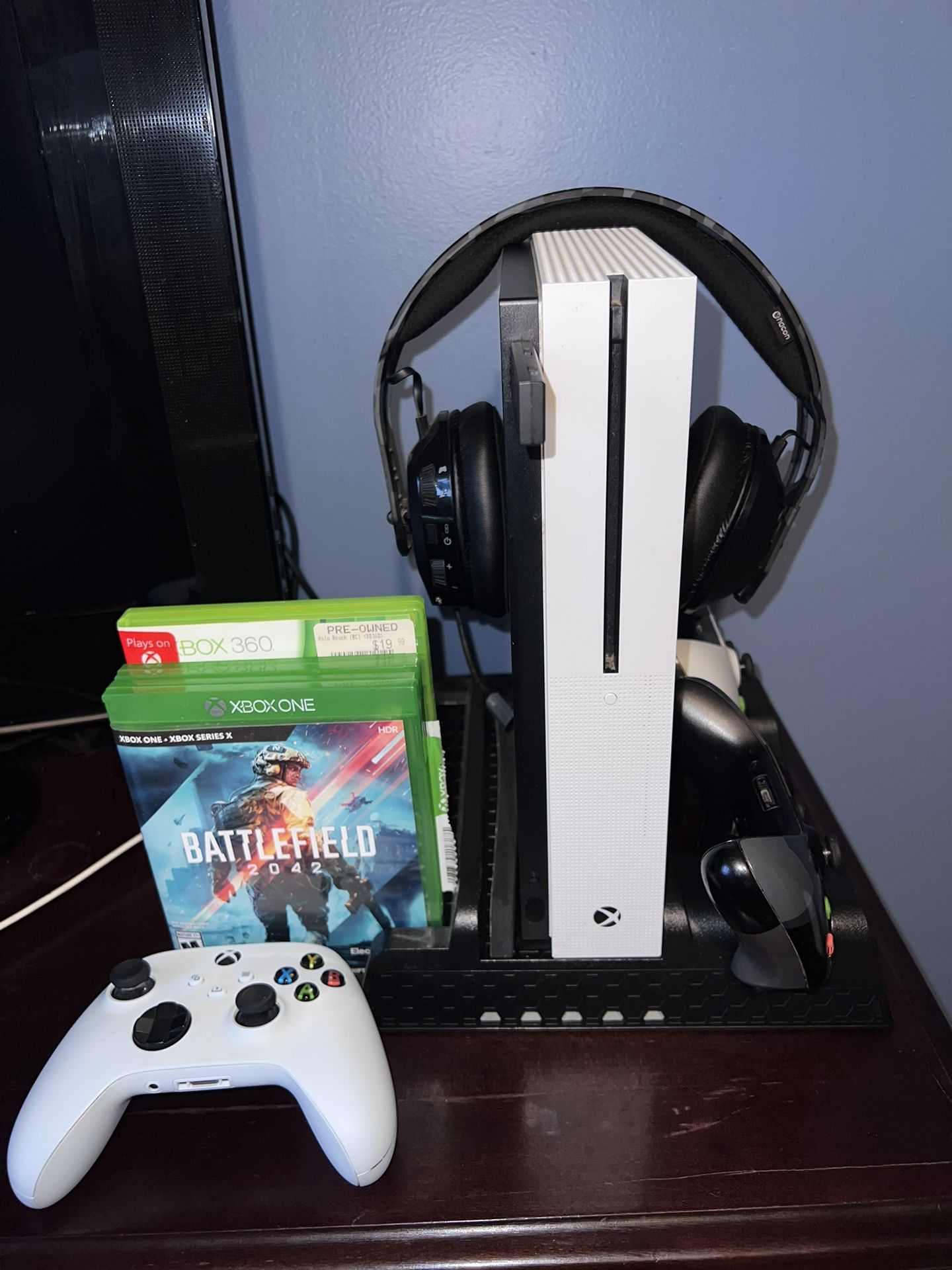 Set comes with: -Xbox One console -Wireless headphones w/ mic & USB to connect -Battlefield 2042 -Halo infinite -Halo Reach -3 Controllers -Game stand that keeps console from heating up Everything works perfectly. Moving so we getting rid of everything and starting over. Asking for $375 since everything’s still in really good condition.