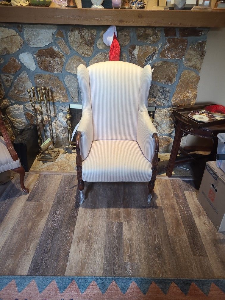 Used antique style chair for sale. Moderate damage/staining on fabric. Perfect for someone who can/likes to refurbish furniture. $50 or best offer