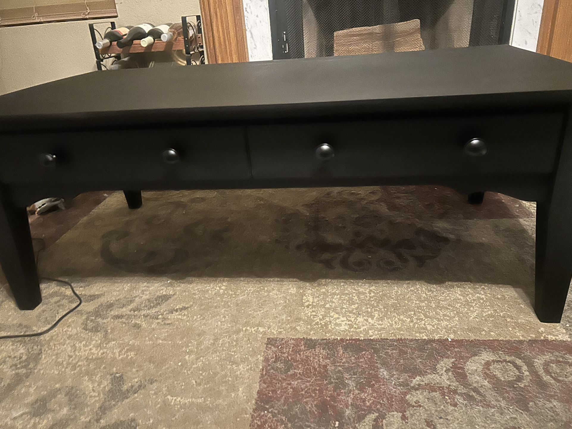 Matte black coffee table that has been refurbished. Comes with a glass protector for the top.