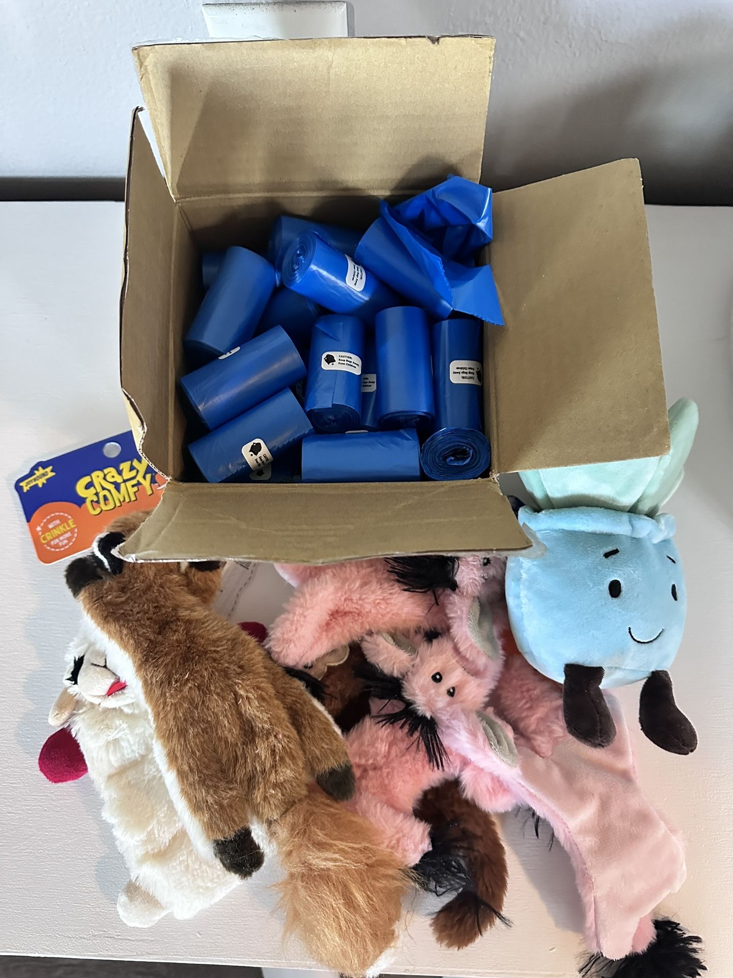 7 new dog toys A full box of poop bags