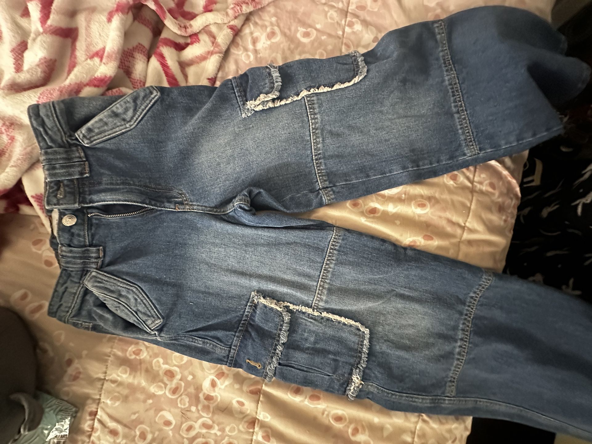 straight leg women’s baggy cargo jeans with white fur on pockets