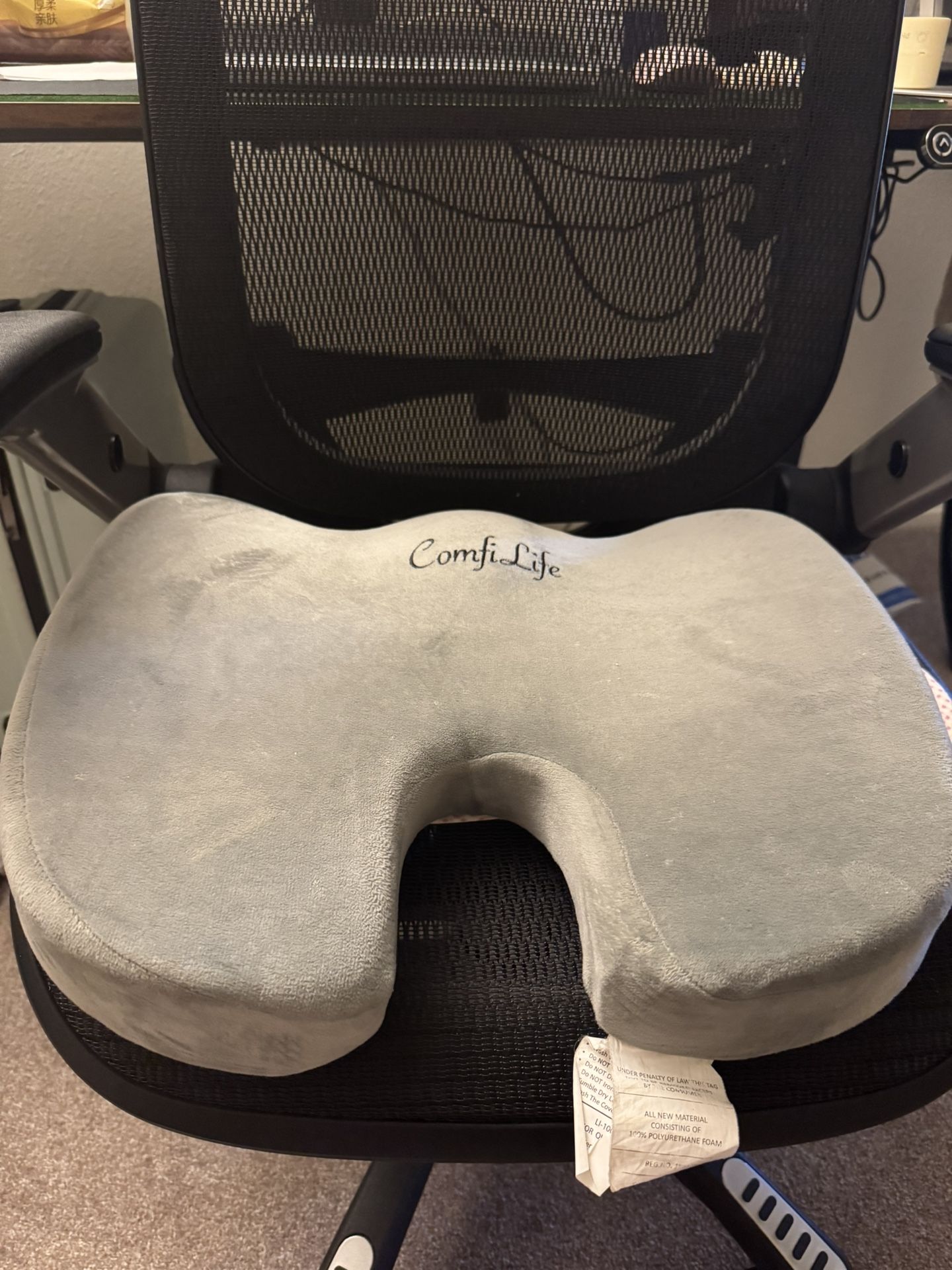 Selling a ComfiLife ergonomic memory foam seat cushion in good condition. Designed with a U-shaped cutout to relieve tailbone pressure and improve sitting posture. • High-density memory foam for comfort and support • Non-slip bottom (see photo) • Removable zip cover • Ideal for office chair, car seat, or long sitting