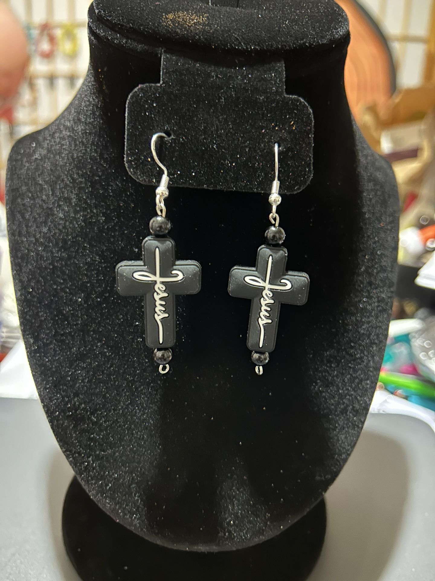 Silver, black, and white “Jesus” earrings for sale. Handmade Costume Jewelry.