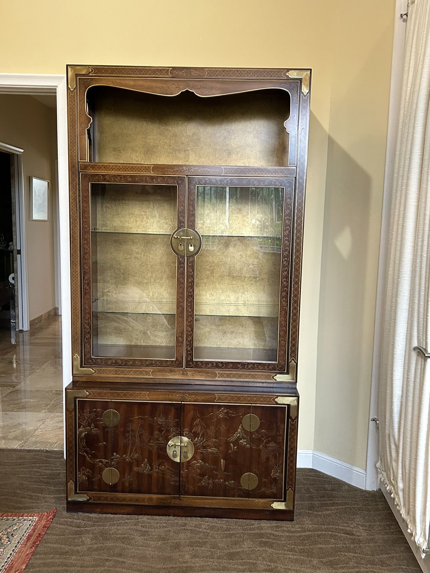 Beautiful vintage Chinoiserie display cabinet in excellent condition. Features hand-painted Asian landscape scenes with pagodas and mountains on the lower cabinet doors, ornate brass hardware with traditional round medallion pulls, glass-front upper display with adjustable glass shelves, and built-in lighting. Two-piece construction (hutch separates from base for easier moving). Gold-toned brass corner accents throughout. Perfect for displaying china, collectibles, or as a stunning statement piece. Dimensions: [add 80 inches x 42 inches x 20 inches] Pickup only - heavy piece, bring help.