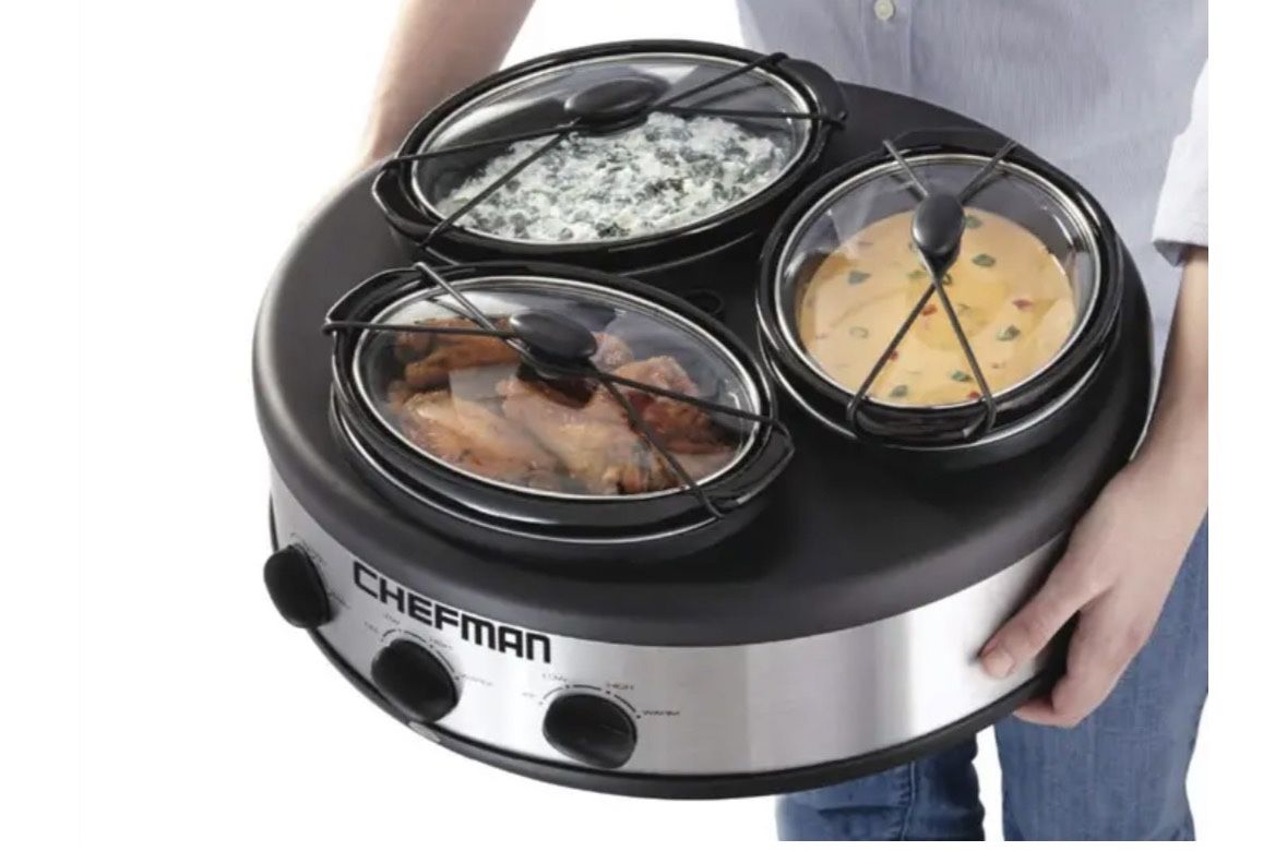Chefman RJ15-15-TO Oval Crock Round Triple Slow Cooker with Individual Heat Control & Lid-Lock Straps, Stainless Steel, 3 x 1.5 quart by Chefman