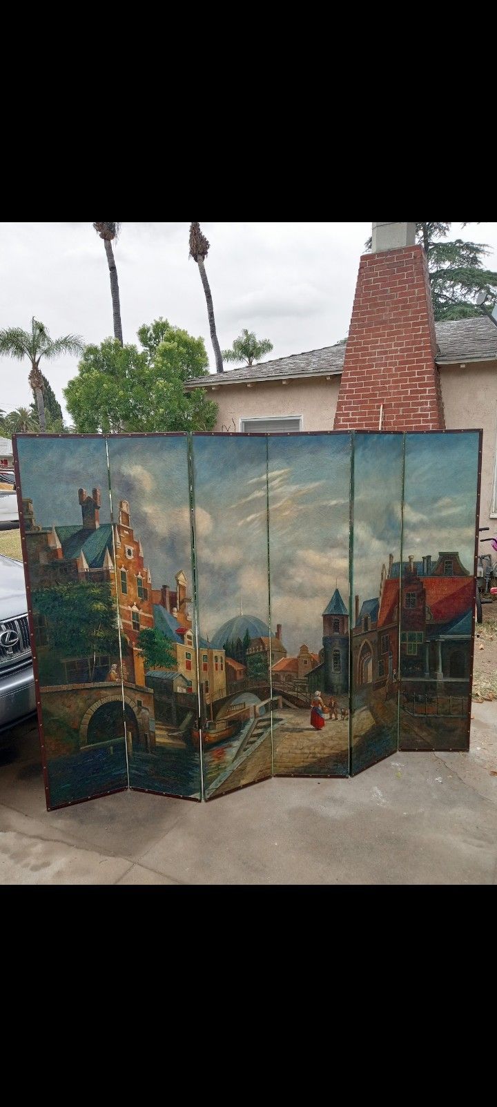 Hand painted room divider with a European canal city scene. Dates back to mid-century.