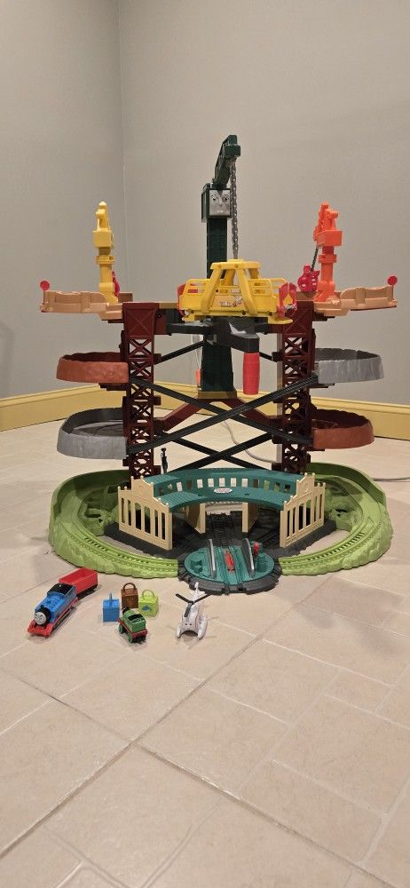 Fully assembled. Excellent condition. Includes motorized Thomas engine, die-cast push along Percy engine, Harold the helicopter, and 3 cargo crates for loading and unloading. 34.25" tall, 32.25" wide. Ages 3 years and up.