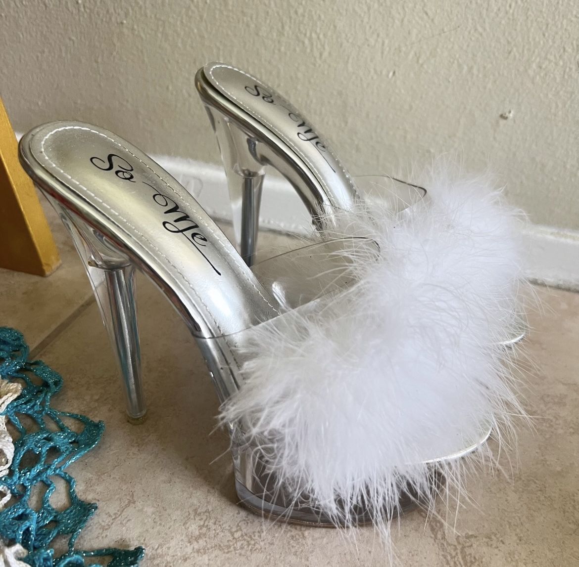fluffy white pleaser style heels size 7.5 PICKUP ONLY
