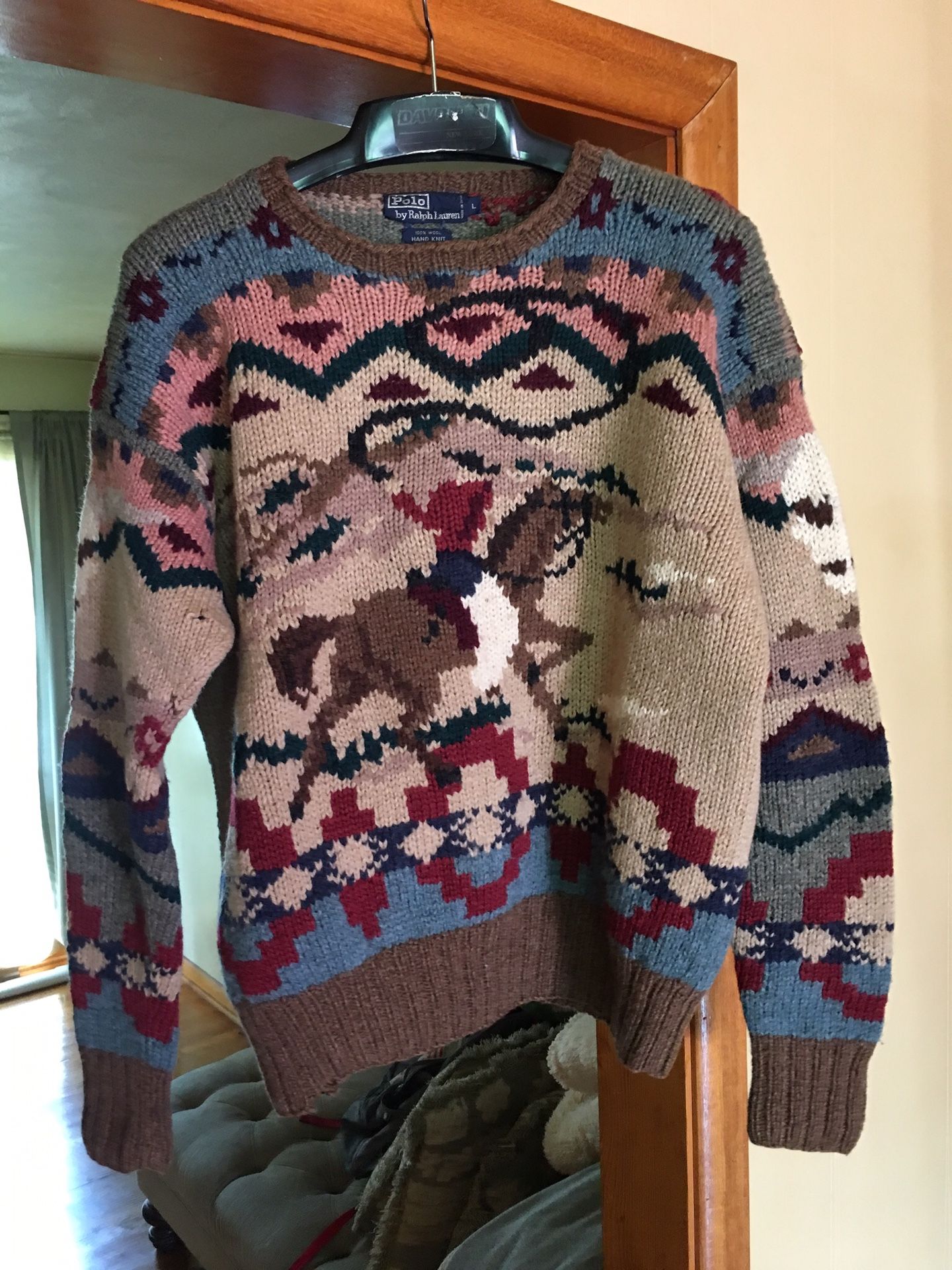 Made famous by Kanye West. Size large. 100% wool. Two issues. One small hole in the right sleeve, and a loose thread at the waist.