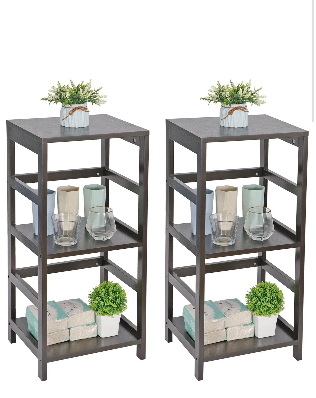 3-Shelf Open Wood Shelving Unit, Living Room End Table, Side Table w/ Storage Shelf Set of 2