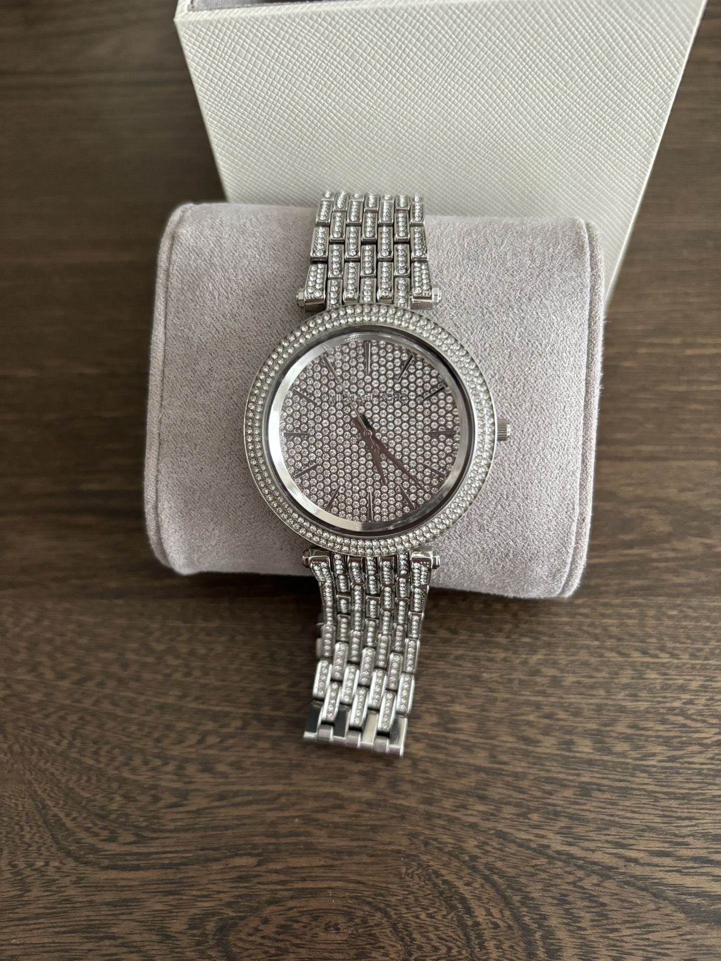 Brand new with box and extra links still on the watch. Fully encrusted with tiny clear crystals. This is from the Darci collection by Michael Kors.