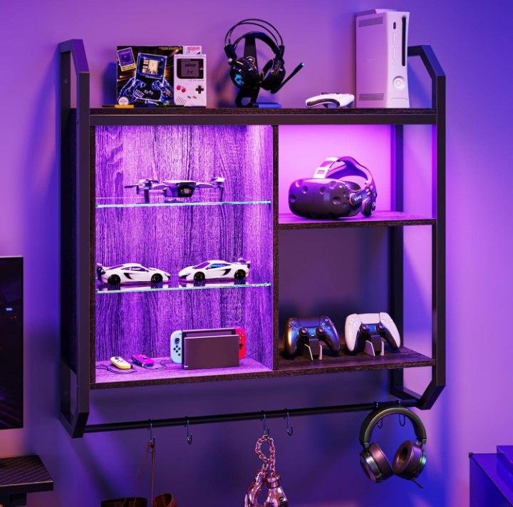 Bestier Gaming Floating Shelves, 34" LED Wall Mounted Shelf with Adjustable Glass Shelf, Pipe Shelves Hanging Display Rack Bookshelf with 6 S-Hook, Gaming Room Decor Wine Coffee Bar Black