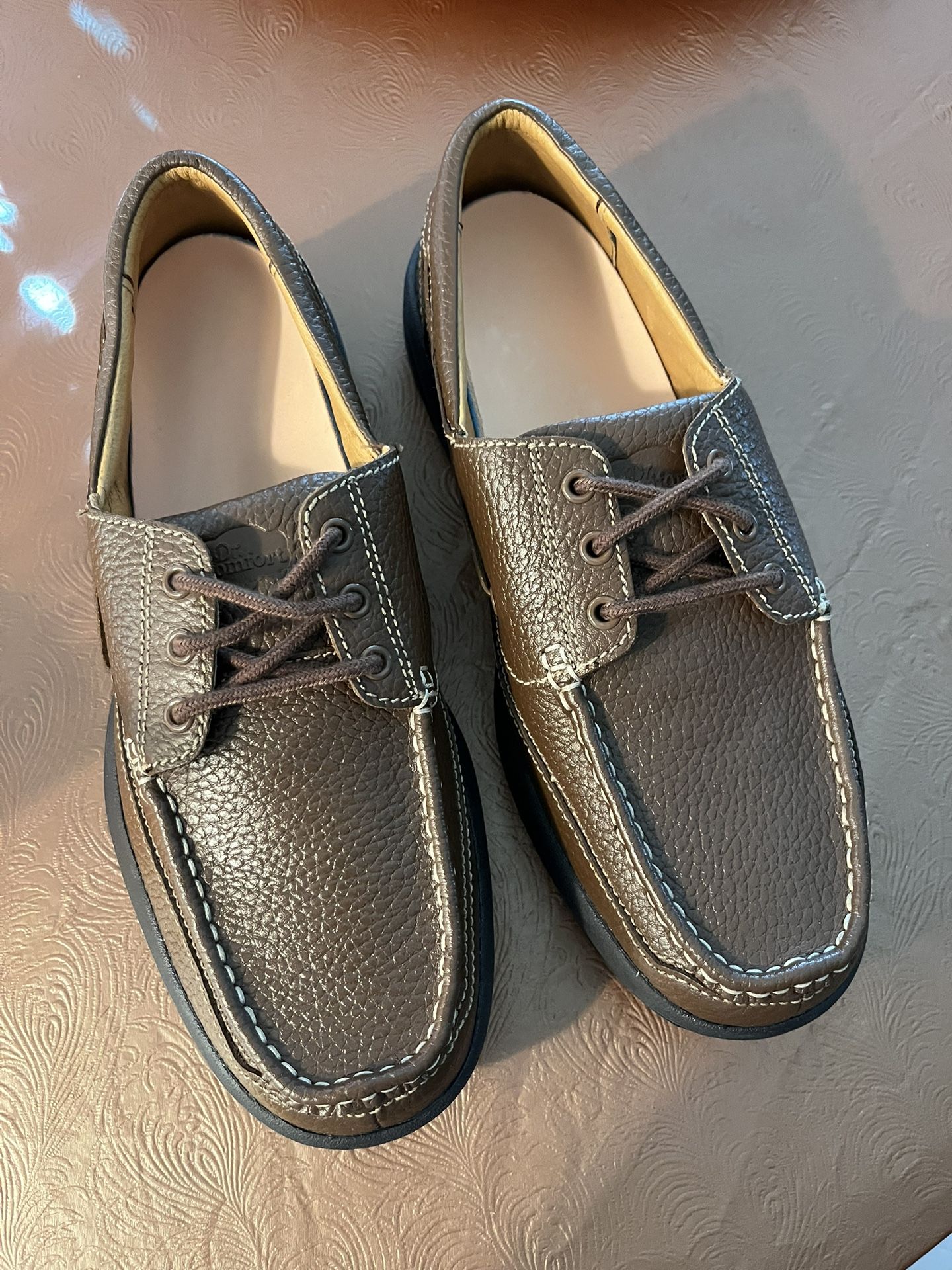 Men’s new without box size 11.5 med all leather Dr Comfort shoes. Removeable orthotic insole Great for anyone with sore feet or diabetes. I just put laces in for display. Never worn Similar to Timberland boat shoes with great stitching details and nice sole Beautiful Pebbled leather