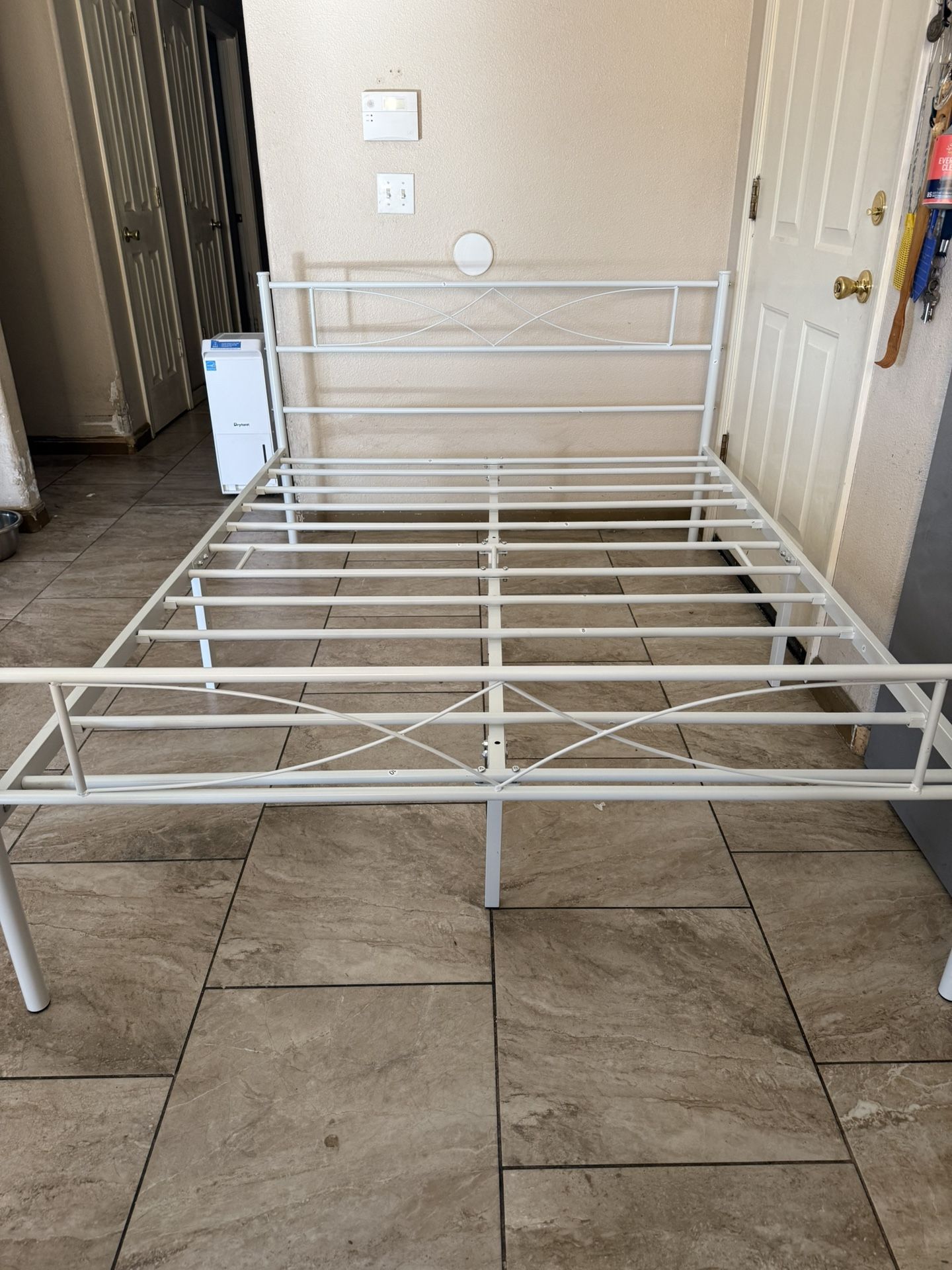 Full size bed frame in white measuring approx 77 x 56 x12 inches under space headboard 34 and footboard 23 inches high Delivery available for 10 dollars in Fresno or you can pick up off Kearney and Fresno street