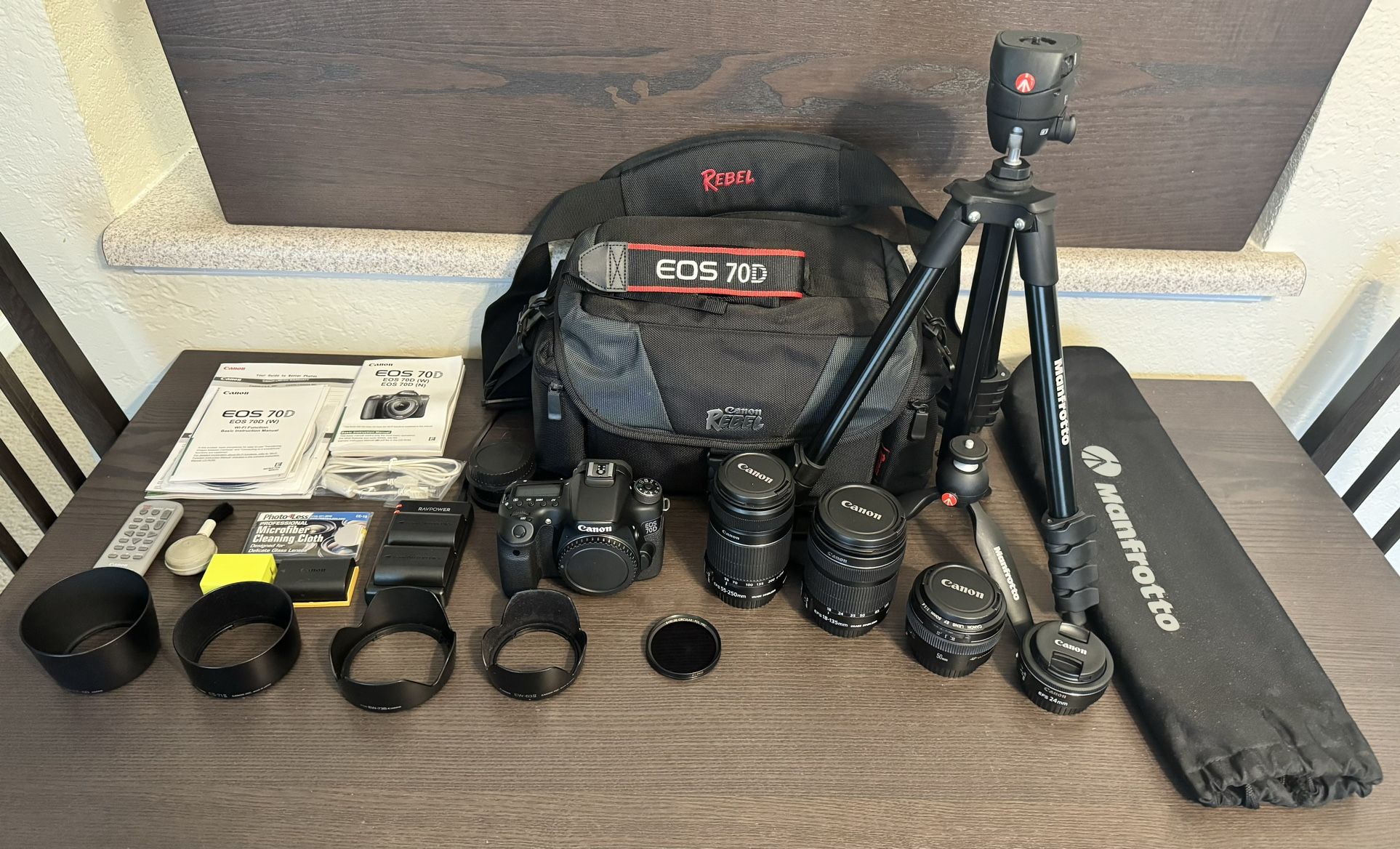 Body: Canon EOS 7D: -20.2 MP APS C CMOS sensor and DIGIC 5 plus -19 point cross type AF System. Up to 7 fps shooting -AF Assist Beam: Effective range: Approx. 13.1 ft. by 4.0m at center, approx. 11.5 ft. by 3.5m at periphery -ISO 100 12800, expandable to 25600 -Dual Pixel CMOS AF for fast focus in live view and video -3 inches articulating touch panel LCD screen with 1,040,000 dots -Built in flash with integrated speedlite transmitter and hot shoe -Intelligent viewfinder with electronic overlay 1080 (30, 25, 24 fps) and 720 (60, 50 fps) HD video (H.264/MPEG 4/MOV) -Instant sharing and remote control with built in Wi Fi and EOS Remote app Lens: Canon EF-S 24mm 1:2.8 STM Canon EF 50mm 1:1.4 Canon EF-S 18-135mm 1:3.5-5.6 IS STM Canon EF-S 55-250mm 1:4-5.6 IS II Filter: B+W 58mm MRC Circular Polarizing Filter Lens Hoods: Canon ES-71 II Canon ET-60 Canon ET-63 II Generic EW-73B Tripods: Manfrotto Pixi Mini Tripod Manfrotto Compact Action Tripod Other: Canon bag Canon camera neck strap 3 Canon batteries 2 slot battery charger Lens cloth Lens brush Remote USB transfer cable Canon user manuals New: $2000+ Selling: $400