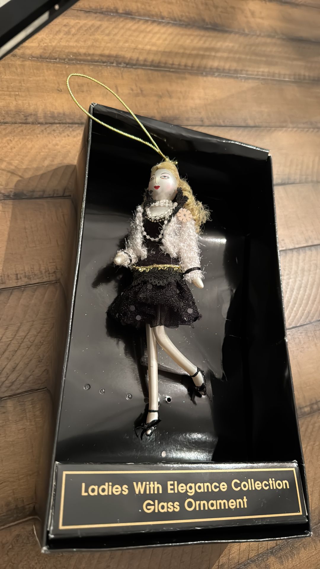 This fancy glass Ornament is adorned with a black sparkly skirt, a cream jacket with pearls and a gold belt. She has blonde curly hair and adorable black tied shoes. This Ornament comes from a smoke free home and is in great condition!