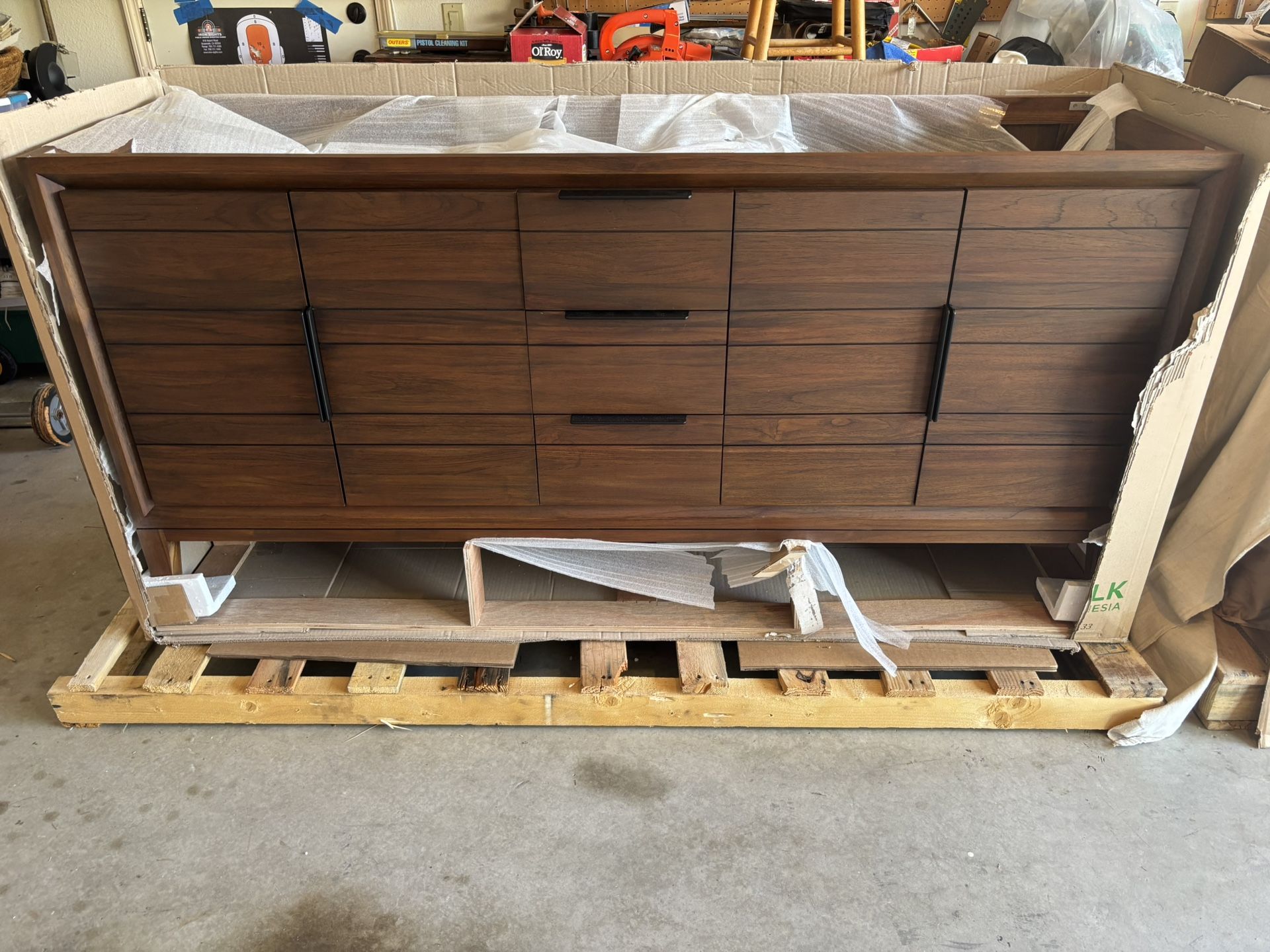 New 72” Solid Teak Wood (no pressboard) Double Sink Vanity. Does not come with counter top or sinks. Never installed or used. Could also be used as a hallway vanity with a solid top. Beautiful piece of furniture that sells for $2599.00 on Ferguson Home. The top drawer does not close completely flush and is off about a 1/4”. Please see photo.
