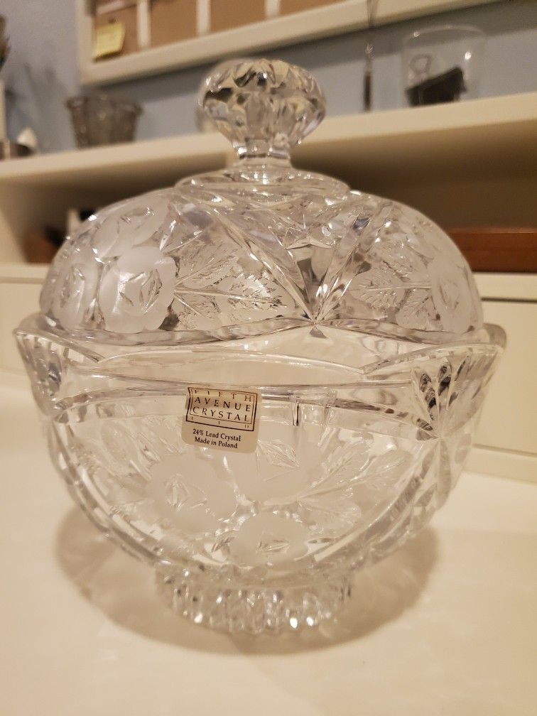 Like new, in perfect condition. Displayed only. Vintage Large Fifth Avenue Crystal Covered Etched Candy Bowl, 8" x 7" - etched with flowers and has a 6.5" x 5" lid which sits on the 7" x 5" Bowl, making the total height of 8". This is made on Poland and contains 24% lead crystal. 4 pounds.