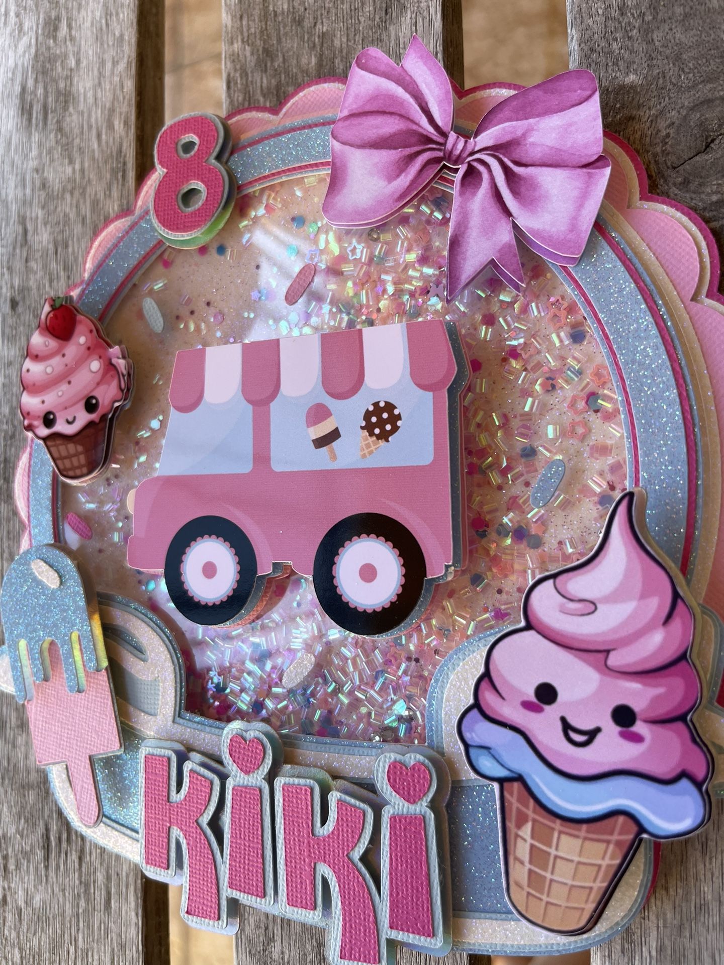 Coquette inspired ice cream shaker cake topper. How great your cake with this lovely shaker cake topper with matching colored beads, sequence and glitter. Topper is located in Homestead, Florida or can be shipped as well. Matching banner and cupcake toppers can be made upon request.