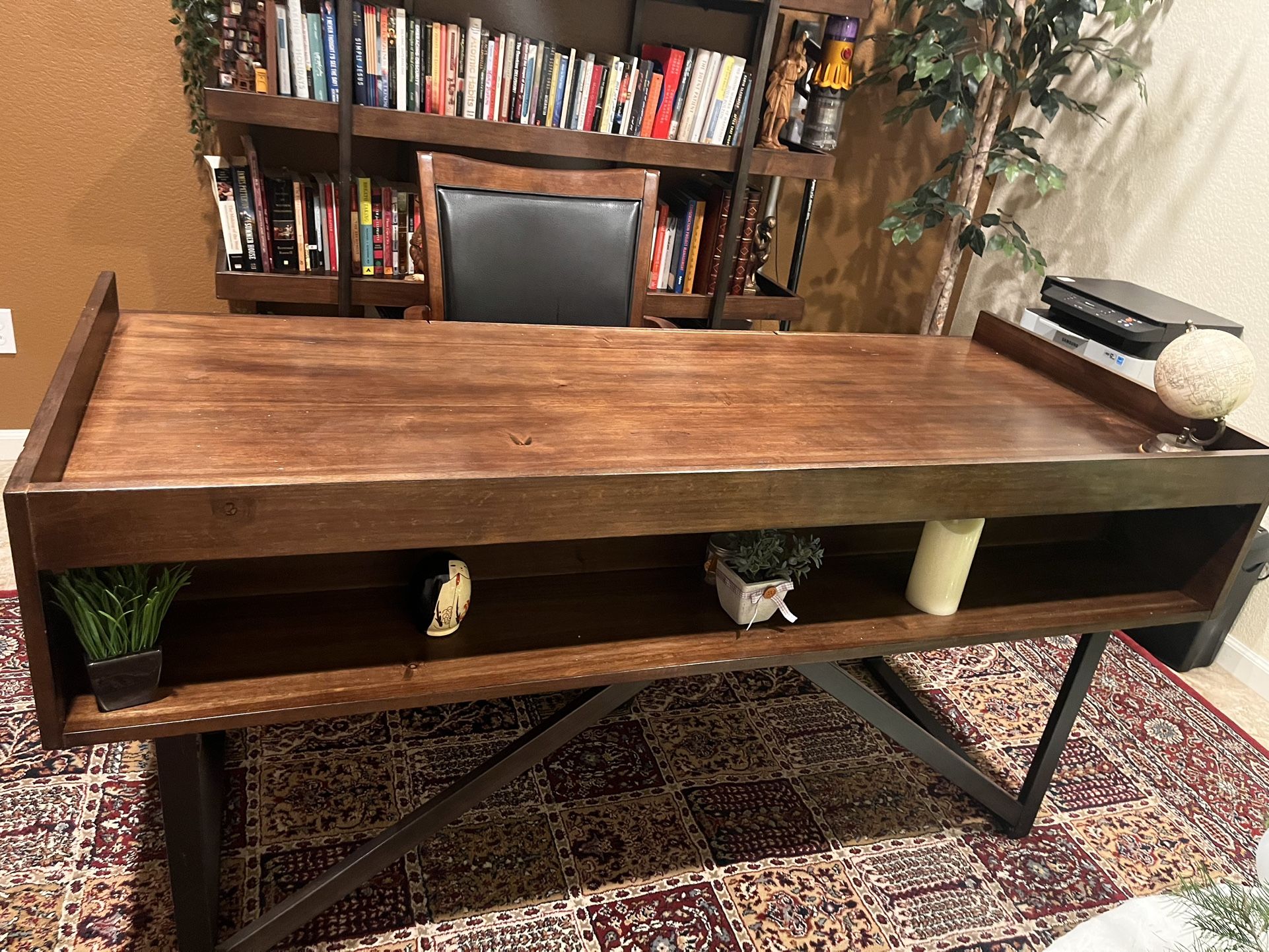 Home office desk and chair included. Desk wood in excellent condition. Only scratches on the metal handles.