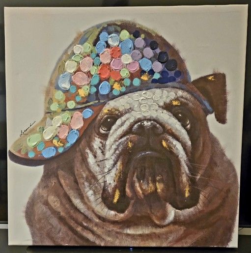 English Bulldog w/Cap Wall Art in Acrylic Paint Modern Printing On Canvas Painting with Hand Embellished Home Decor 25" H x 25" W Painting mounted on a lightweight wooden frame with 2 loop hooks for easy hanging Very good condition with mild wear on one of the edges $50/obo Washington DC pickup