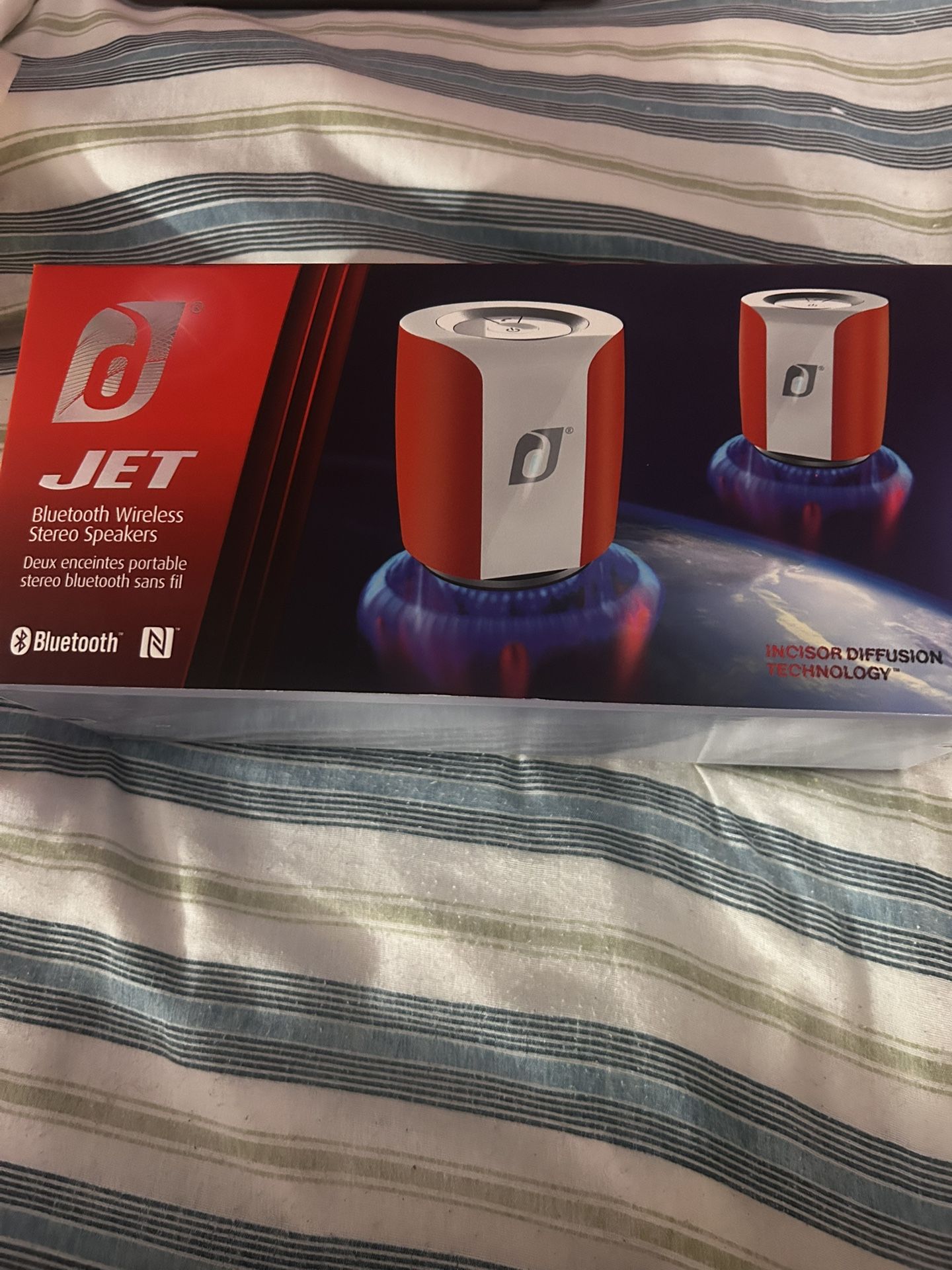 I have a Brand New pair of Damson Jet Bluetooth speakers. They work differently than an ordinary Bluetooth Speaker, pair them to a tablet, phone, iPod, laptop, Desktop, MP3. Place them on any surface free of loose items and they create a speaker out the entire surface. They appear to be Red in color, which is one of the major deciding factors to purchase them. They’re Burnt Orange in color. Which is why I’m selling them. 1 of a 1000. I’ve owned a few of Damson products and they are all of exceptional quality as well as sound. The red box is the outer box, there’s a second box on the inside sealed in the factory’s plastic.