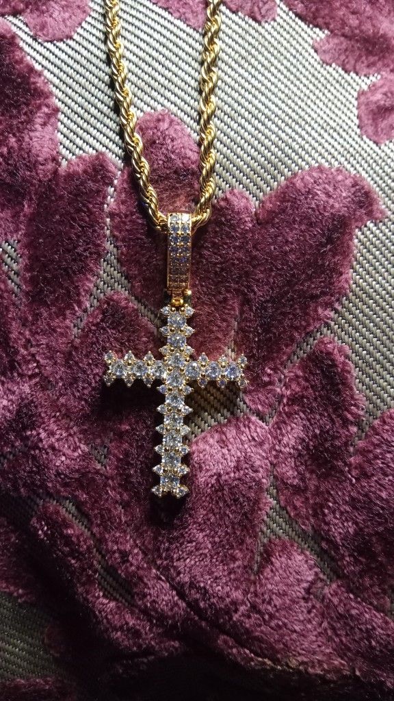 Complete your style with the Flooded Diamond Cross 22" gold necklace from The Gold Gods. This 22" inch, 18k PVD gold plated rope style chain holds an iced out cross pendant with handset VVS CZ stones for a one-of-a-kind addition to your jewelry collection. Sold @ Zumiez. Out of stock online. Regularly $119.95. Selling for $81.99. selling for 40. Brand New w/o box and tags. Never worn. Added a second 18" chain that just thicker. 18kt gp as well.