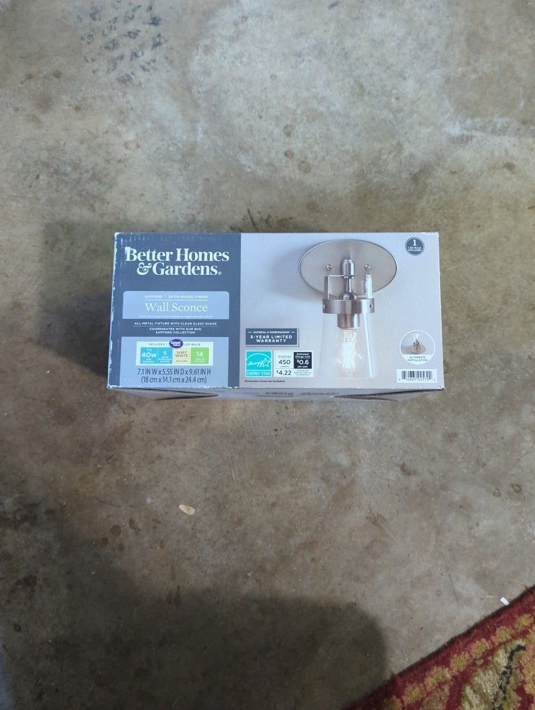 Better homes and garden Wallace scone Stafford / satin nickel finish All metal fixture With clear glass shade Brand new Installs pointing down or up