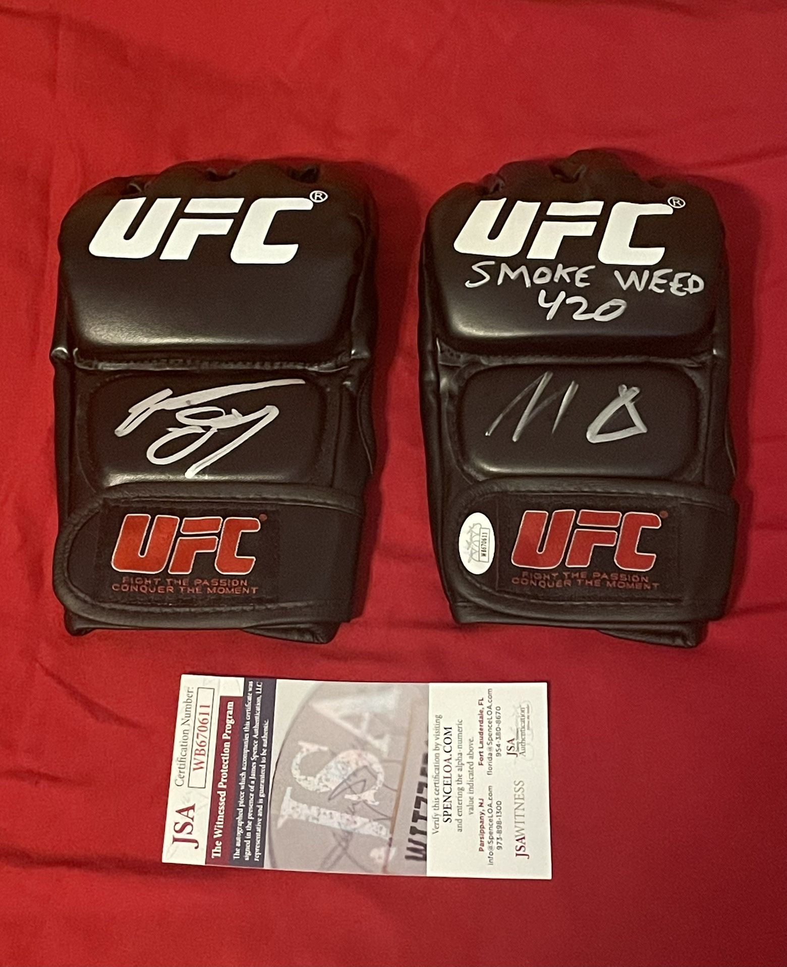 Set of 2 authentic UFC fighter gloves autographed by Nate and Nick Diaz both come with COA Nate Diaz certified Beckett Nick Diaz “smoke weed 420” inscription certified JSA