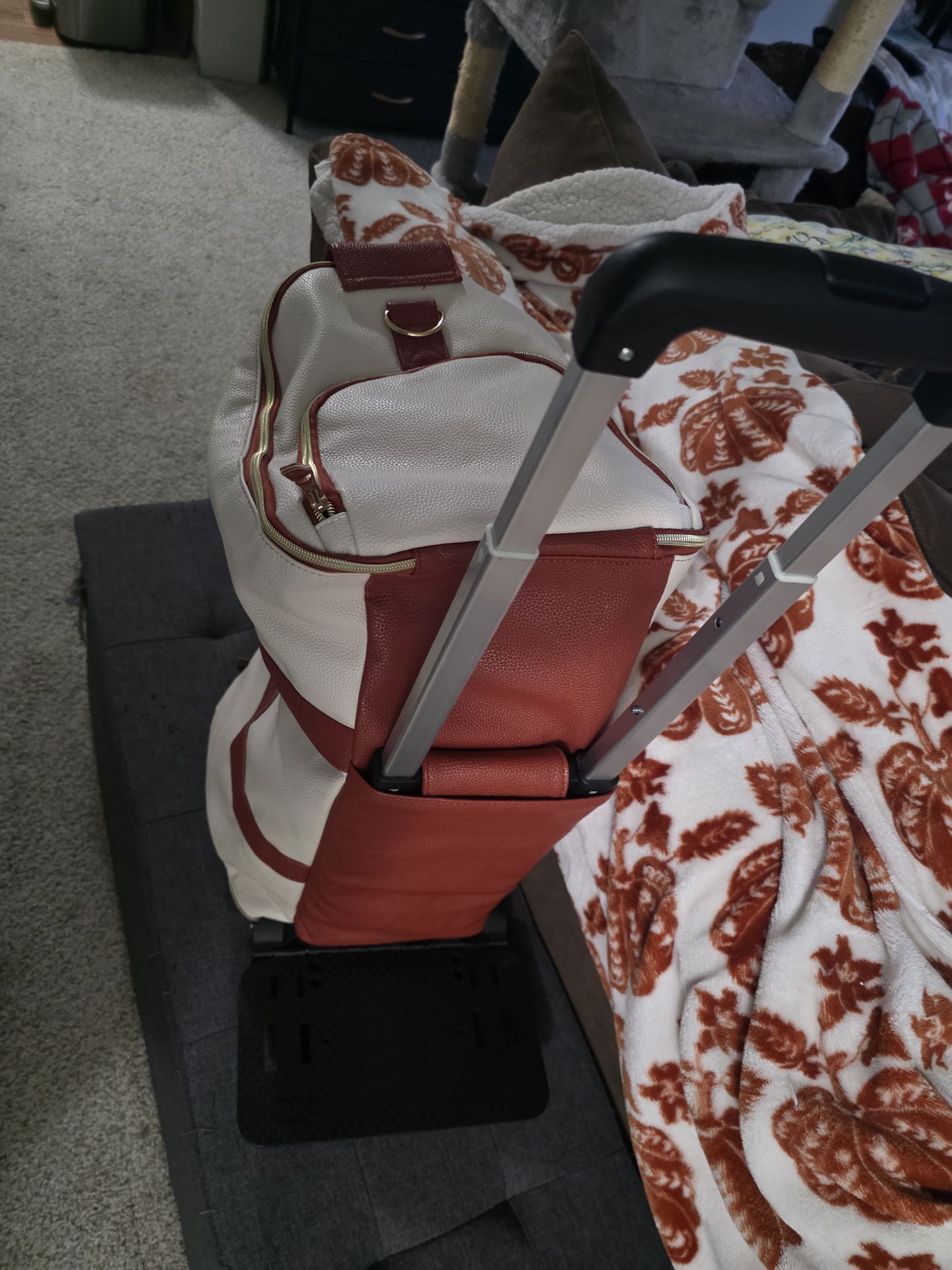 NEVER USED. White/cream and brown. Comes with a shoe bag, shoulder strap, and pink cosmetics bag. Has lots of pockets, comes all the away apart to layer clothes out in the bag. Has a hook for hangers. Has detachable wheels, so you can roll it or carry it. Wheels fit inside the bag. Bought for $90. Asking $75