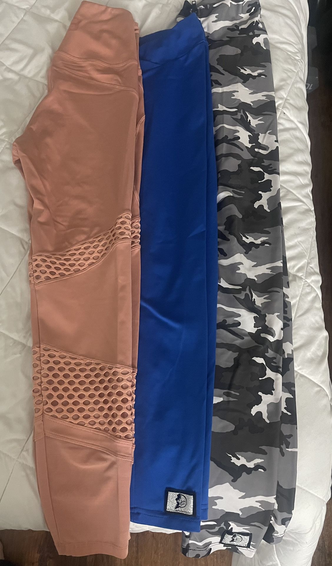 Bundle of 3 premium gym leggings. All Size Small. Great normal-wear condition. Includes: • Better Bodies peach mesh leggings – great condition, no holes • Celestial Bodies blue scrunch leggings – logo patch, great stretch • Celestial Bodies gray camo scrunch leggings – logo patch, flattering fit No stains or damage. Smoke-free home. Perfect for gym, athleisure, or everyday wear. Selling as a bundle only. Price: $40. Local pickup Swedesboro or Wilmington