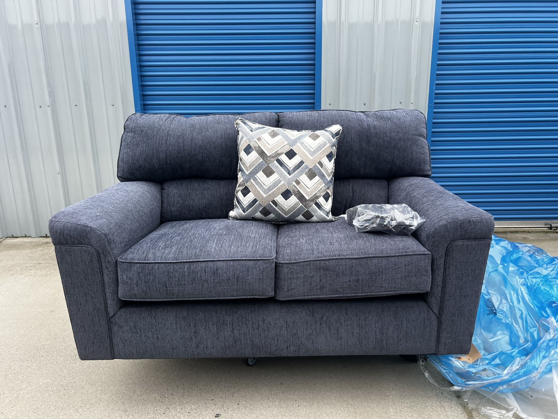 Brand New. Single Lane Love Seat Sofa. Tru Blue color with accent pillow. $349. Only 1 sofa available Dimensions: Width: 59 1/2" Depth: 37 1/2" Height: 37”