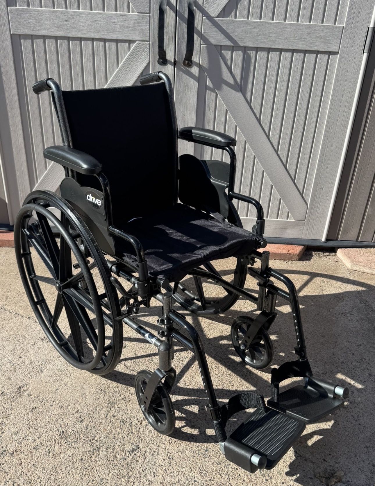 New, never used, and in perfect condition. 16" lightweight wheel chair with swing away foot rests. Smaller chair, perfect for kids or smaller people. Lightweight making it easy to load. Thank you