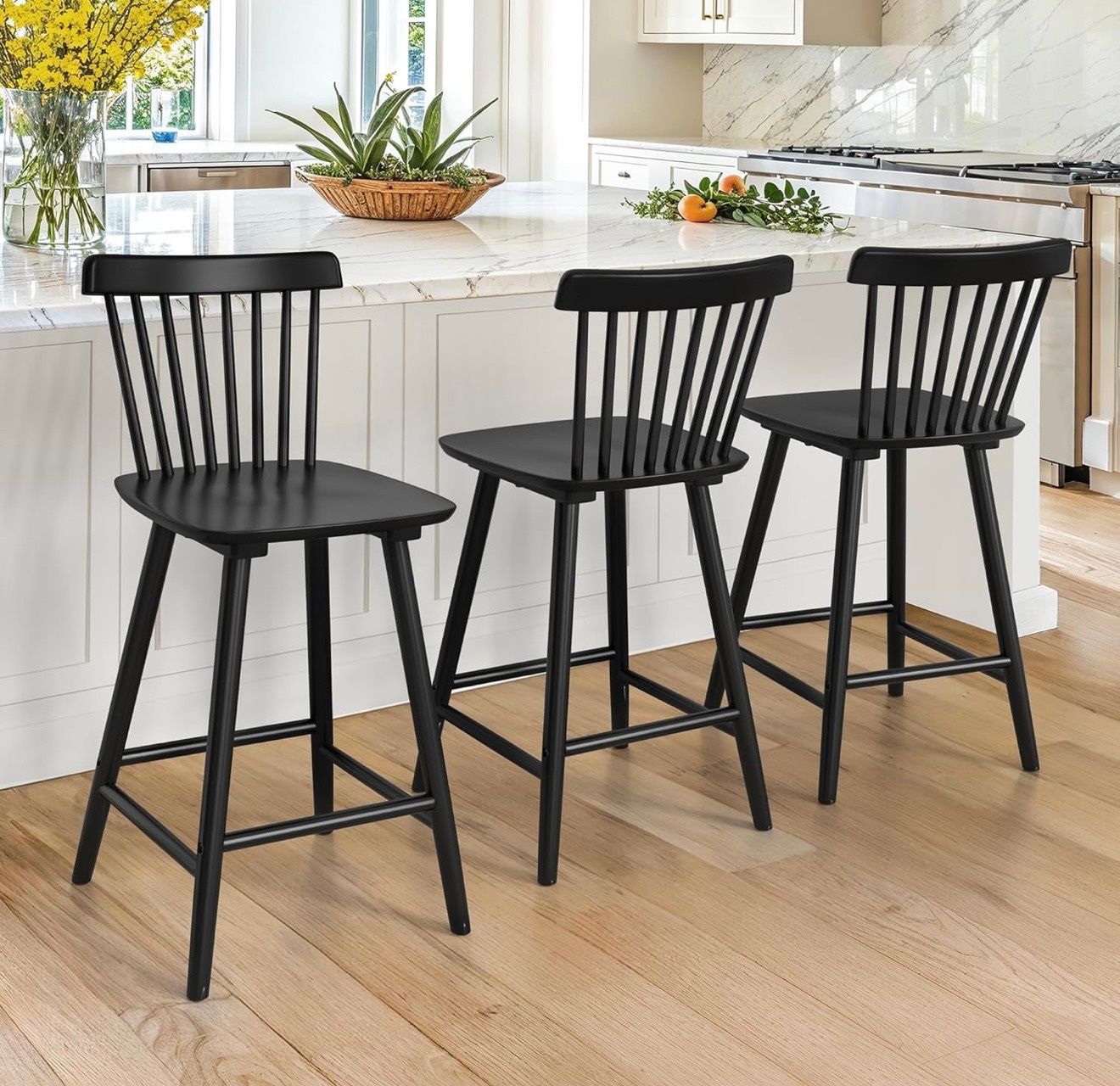 Windsor Wooden Bar Stools Set of 3 for Kitchen Island, Farmhouse 24 Inch Counter Height Stools Chairs with Spindle Back, Black