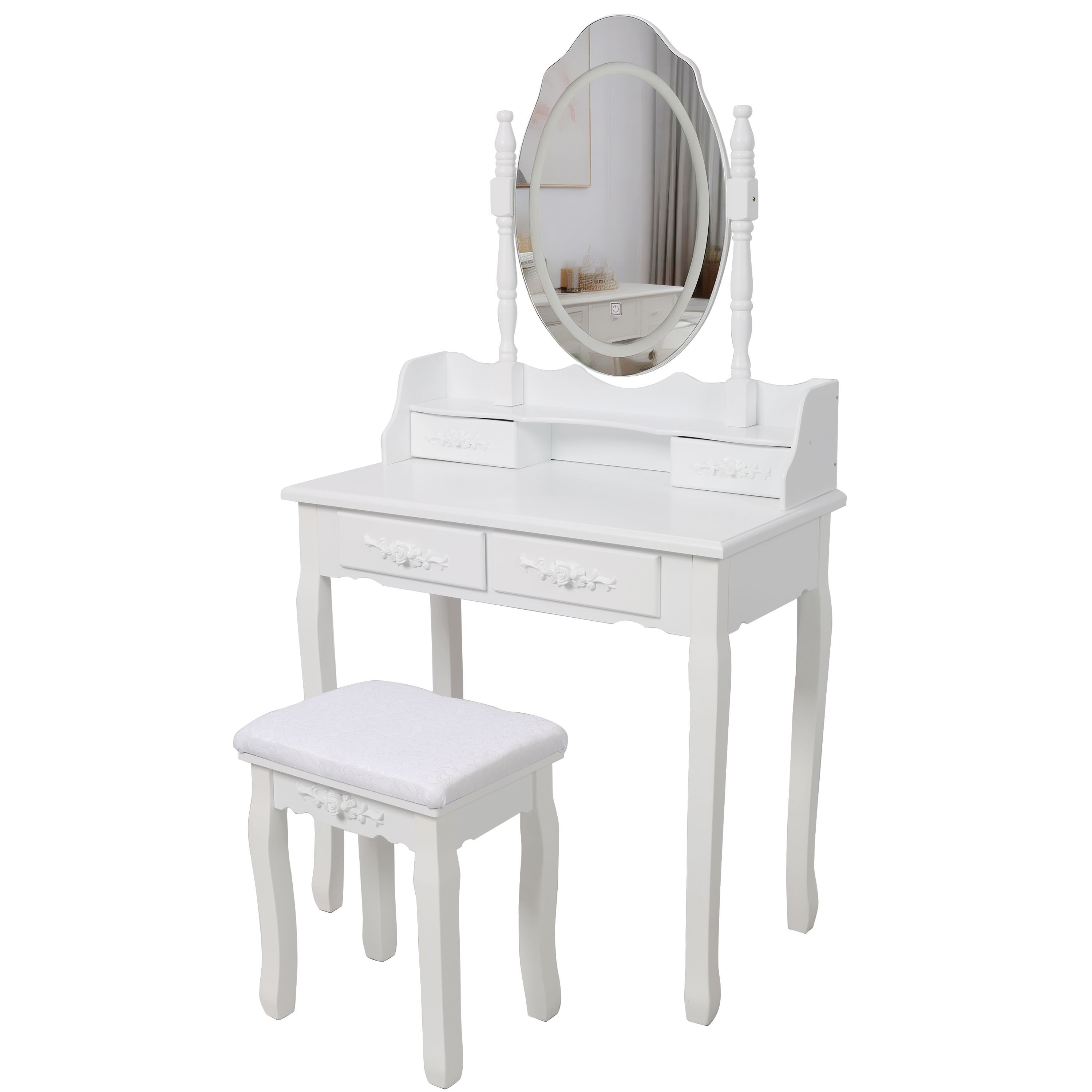 White Princess Vanity Desk Set with Mirror & Cushioned Stool,Light Modes,4-Drawer Wooden Makeup Vanity Table for Girls' Bedroom, Dressing Table with Ample Storage Package Size : Length (in.): 32.30 Width (in.): 20.50 Height (in.): 13.80 Weight (lbs.): 42.50 Product Dimensions : Assembled Length (in.): 29.50 Assembled Width (in.): 15.80 Assembled Height (in.): 55.00 Product Weight (lbs.): 36.50 【Makeup Desk with LED Light Mirror】Exquisite vanity table mirror with built-in LED light strips, bringing you a whole new makeup experience. 【Spacious Tabletop & 4 Drawers for Ample Storage】Equipped with a large tabletop and four practical drawers, this vanity desk offers generous storage space for all your makeup, jewelry and beauty accessories. The two bottom drawers are extra-large for bulk storage, while the double-layer tabletop design enables neat classification—letting you find all your essentials at a glance. 【Comfortable & Multi-Purpose Stool】The stool is padded with high-density sponge for long-lasting resilience and durability, and its decorative patterned upholstery boosts visual appeal while ensuring great breathability. Beyond a vanity stool, it also doubles as a piano bench, shoe bench or footrest, making it a versatile addition to your home. 【Premium Materials & Sturdy, Stable Frame】Crafted with a smooth MDF tabletop and legs, this vanity set boasts a robust, wobble-free structure for long-term use. Non-slip foot pads add extra stability and protect your floors from scratches. 【Stylish Home Accent & Effortless Assembly】With a sleek, modern design, this makeup vanity seamlessly complements your existing home furniture and acts as a chic decorative piece for any bedroom or dressing area. Assembly is a breeze, with clear, easy-to-follow instructions and all necessary hardware included in the package. W465P391682 CA8