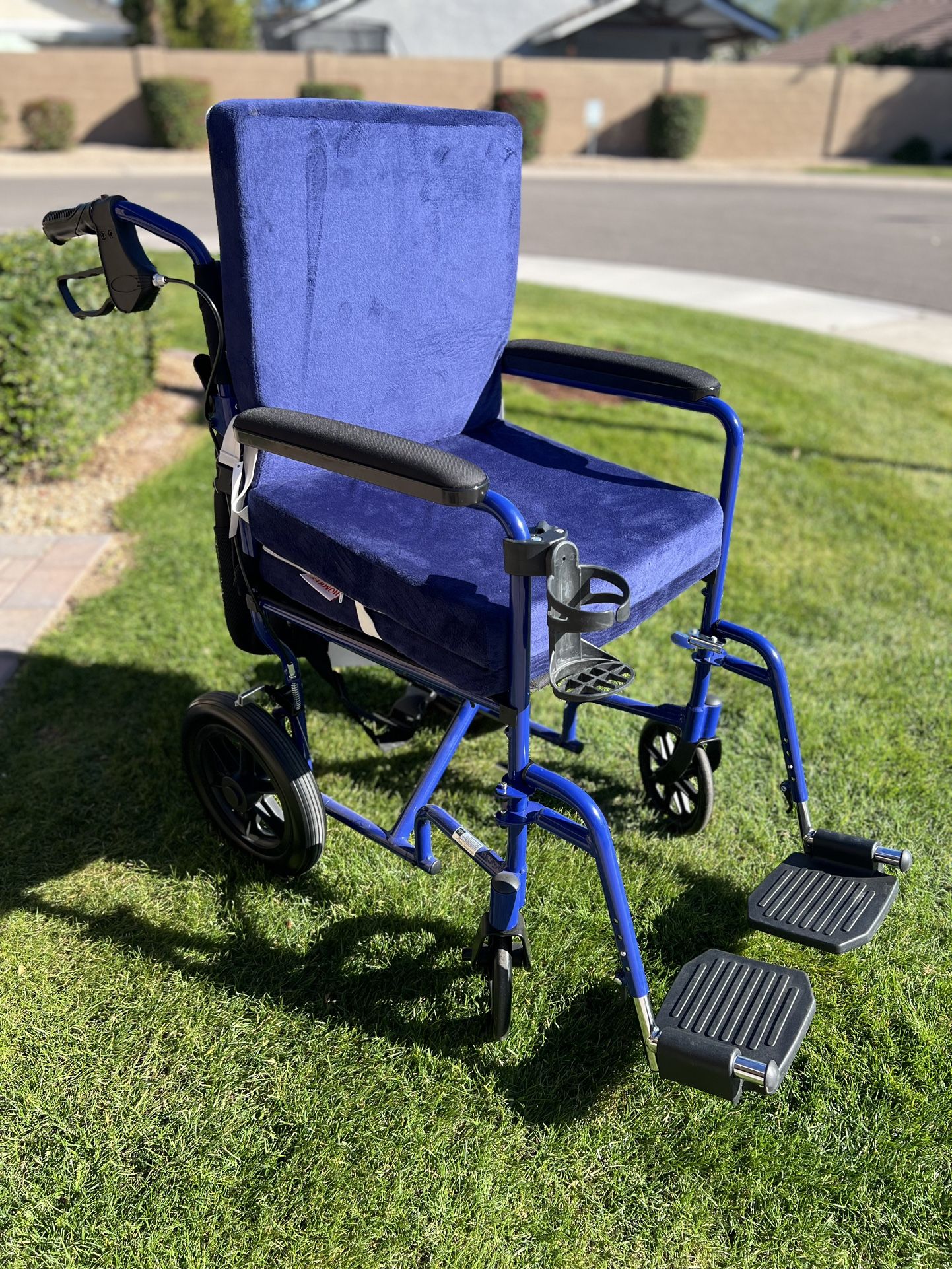 It is clean, sturdy, and in very good working condition. Details & Features: • Medline brand wheelchair • Comfortable padded seat and back cushion (blue) • Folding frame for easy transport and storage • Detachable Footrests included • Rear push handles with hand brakes • Storage pouch on the back • Cup holder attached • Large rear wheels with front swivel wheels • Extra seat cushion included (shown in photos) This wheelchair has been well cared for and everything functions as it should. Only minor signs of normal use. We are located in North Scottsdale just 1 block east of the 101 at the Cactus exit Thank you